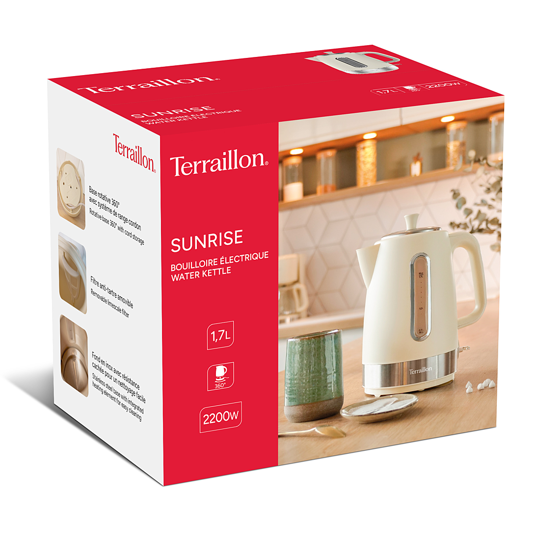 Ajoutez une touche de sophistication à votre cuisine avec notre bouilloire SUNRISE. Sa couleur crème associée à des détails chromés lui confère un charme rétro et un style chaleureux, tandis que son bandeau en inox brossé rappelle les éléments inox de la cuisine. Avec son fond en inox et sa résistance cachée, bénéficiez d'une plus grande sécurité et d'un nettoyage facilité. Son filtre anti-calcaire amovible vous permet d'éviter les dépôts d'eau calcaire dans vos boissons tout en prolongeant la durée de vie de votre bouilloire