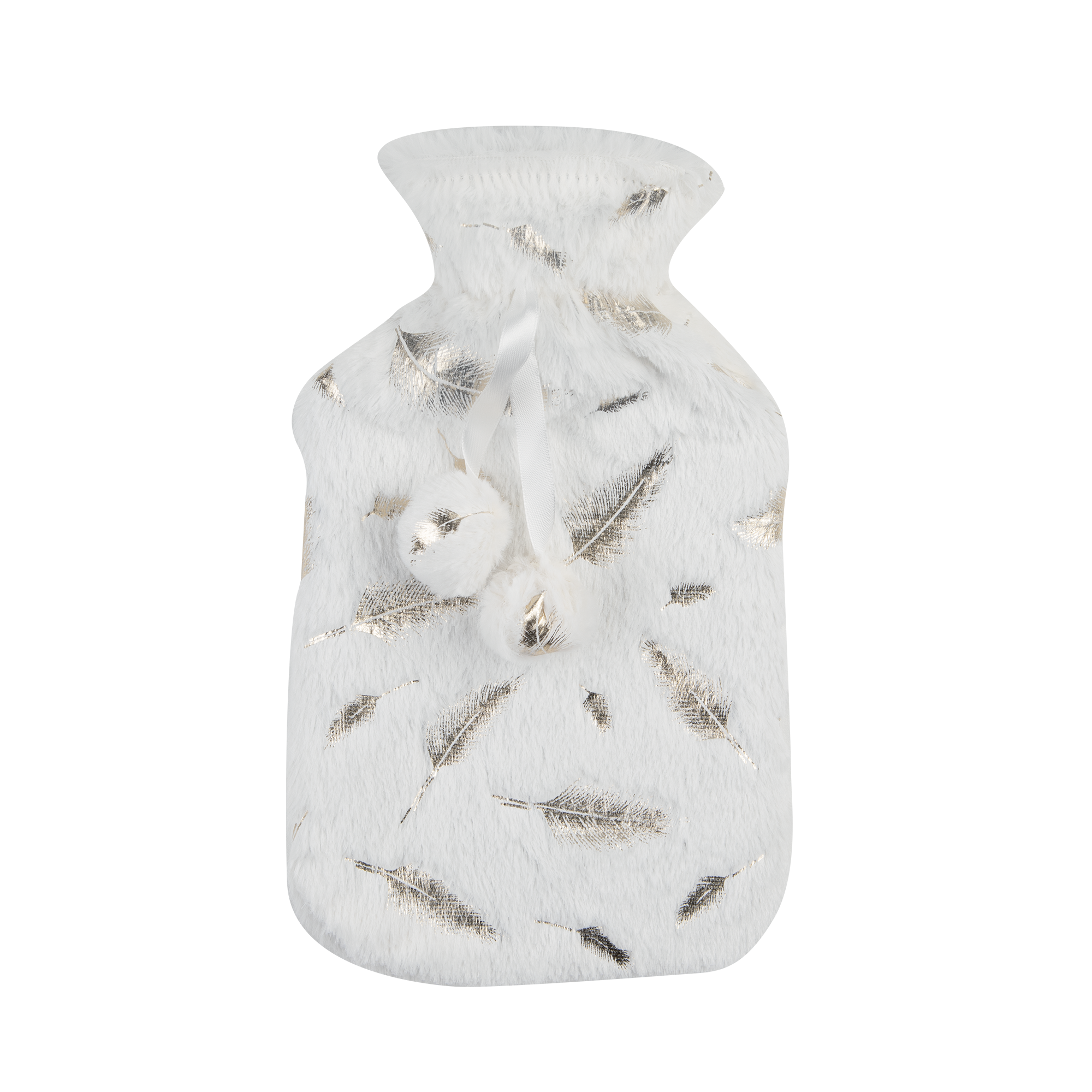 Bouillotte en caoutchouc naturel 1L dans une housse blanche à impression plumes. La housse peut être enlevée pour être lavée.