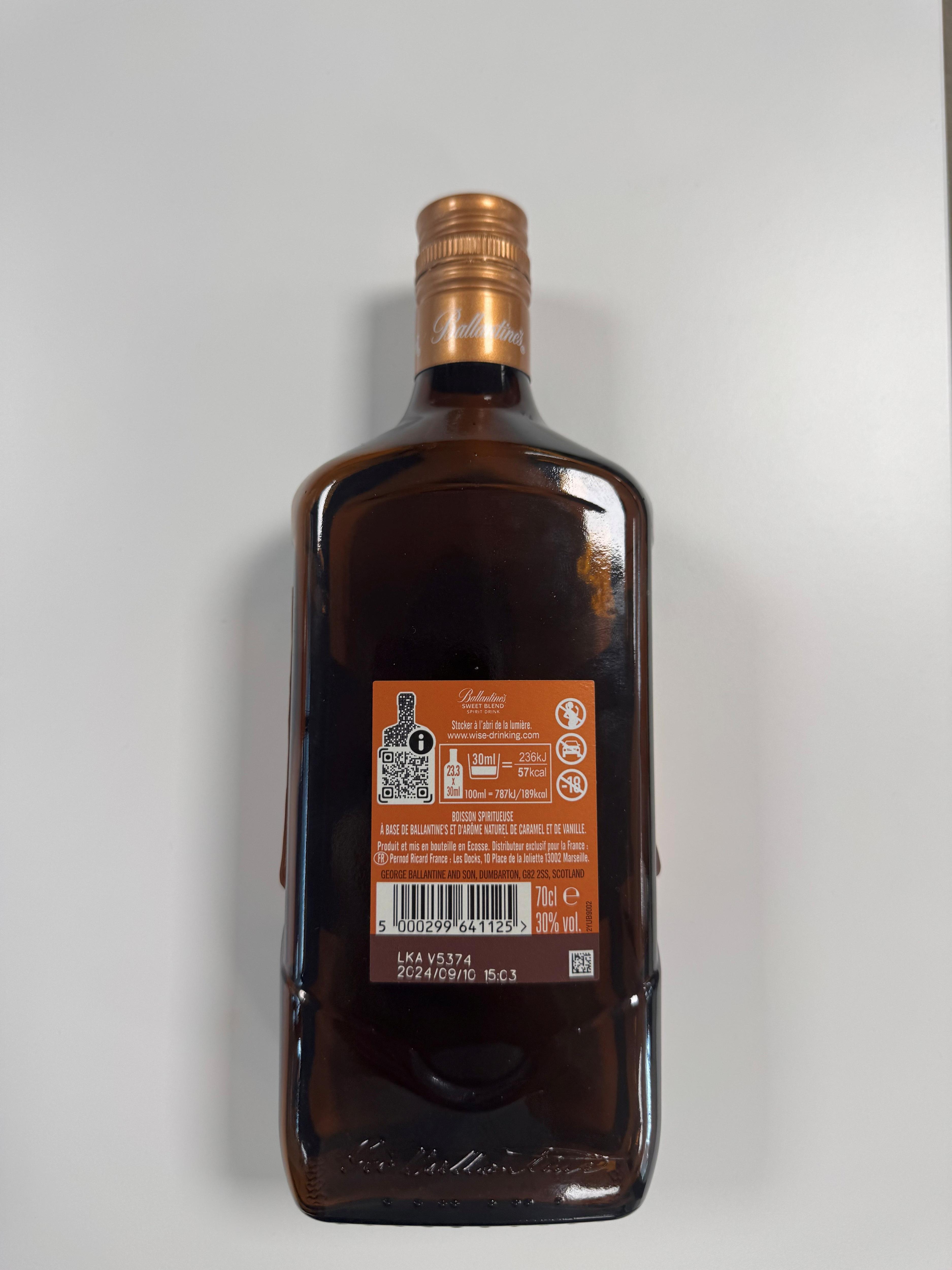 Dégustation olfactive (Nez) Noisettes, gousses de vanille, caramel au beurre mêlé à des pommes caramélisées pour sublimer le whisky traditionnel Ballantine’s.
