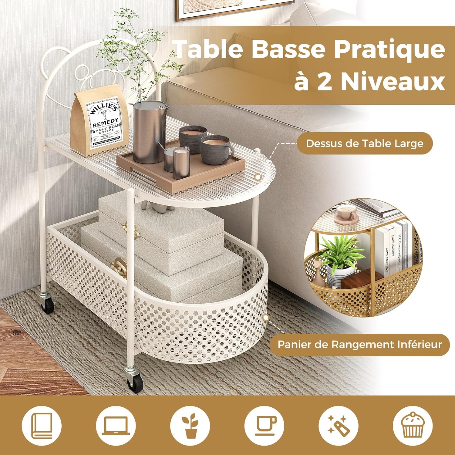 | Libellé | Bout de canapé mobile avec 4 roues et frein, chariot de rangement 2 niveaux en métal, plateau en verre |