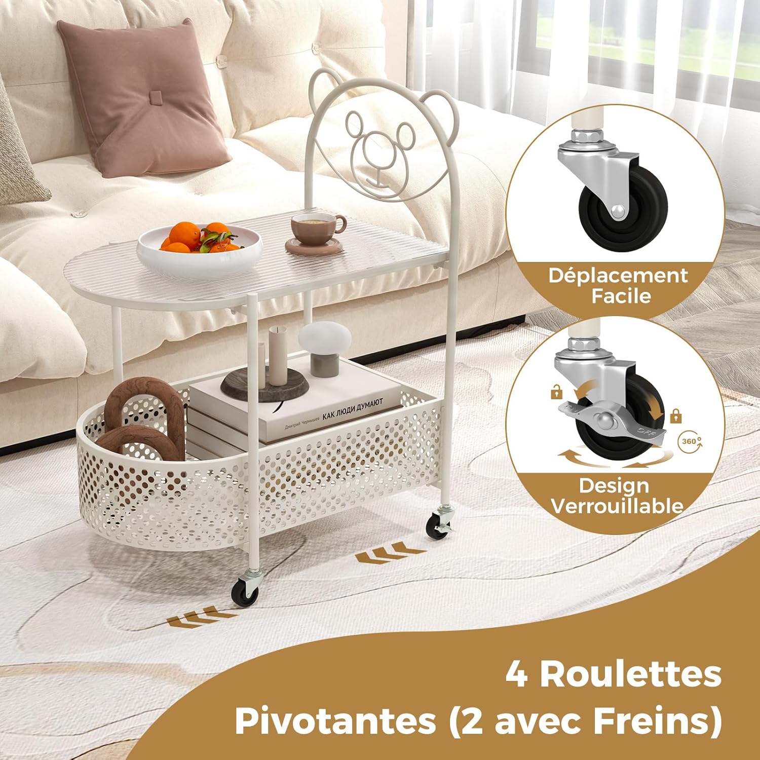 Bout de canapé mobile avec 4 roues et frein, chariot de rangement 2 niveaux en métal, plateau en verre