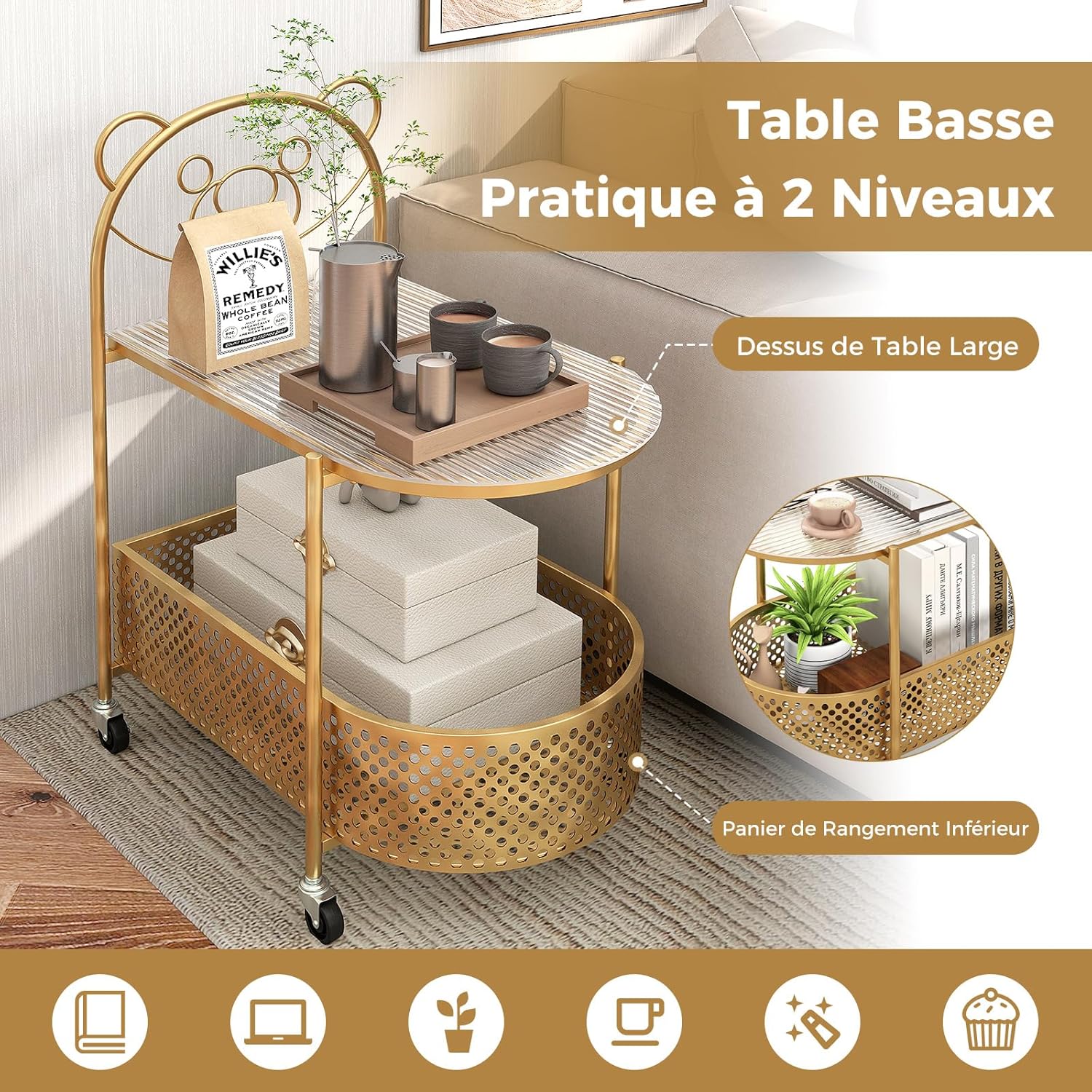 | Libellé | Bout de canapé mobile avec 4 roues et frein, chariot de rangement 2 niveaux en métal, plateau en verre |