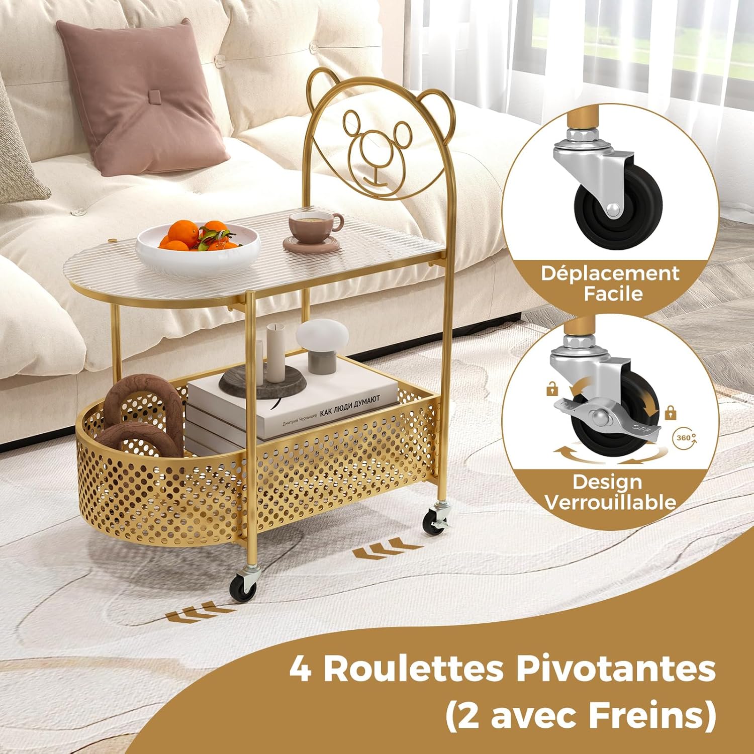 Bout de canapé mobile avec 4 roues et frein, chariot de rangement 2 niveaux en métal, plateau en verre