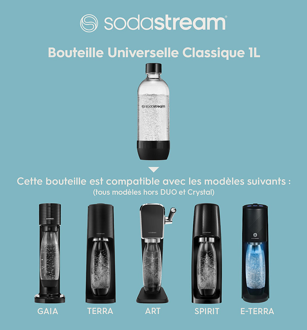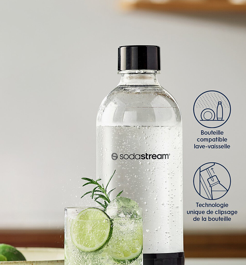 Bouteille pour conserver vos bulles toute la journée ! Bouteille (1L) compatible lave-vaisselle garantie sans Bisphénol A (BPA) pour réaliser toutes vos boissons ! - Bouteille Classique grand modèle 1L sans BPA* compatible lave-vaisselle - 0,84L jusqu’à la ligne de remplissage - 1 bouchon avec un joint permettant de conserver plus longtemps sa boisson pétillante - Bouteille réutilisable pendant 3 ans (voir date limite d’utilisation au dos de la bouteille). Véritable alternative aux bouteilles en plastique à usage unique et répondant aux nouvelles habitudes de consommation Bouteilles compatibles avec toutes les machines Sodastream sauf DUO & Crystal