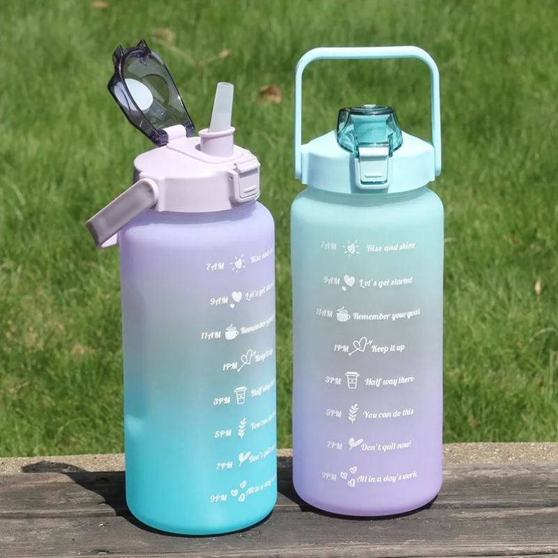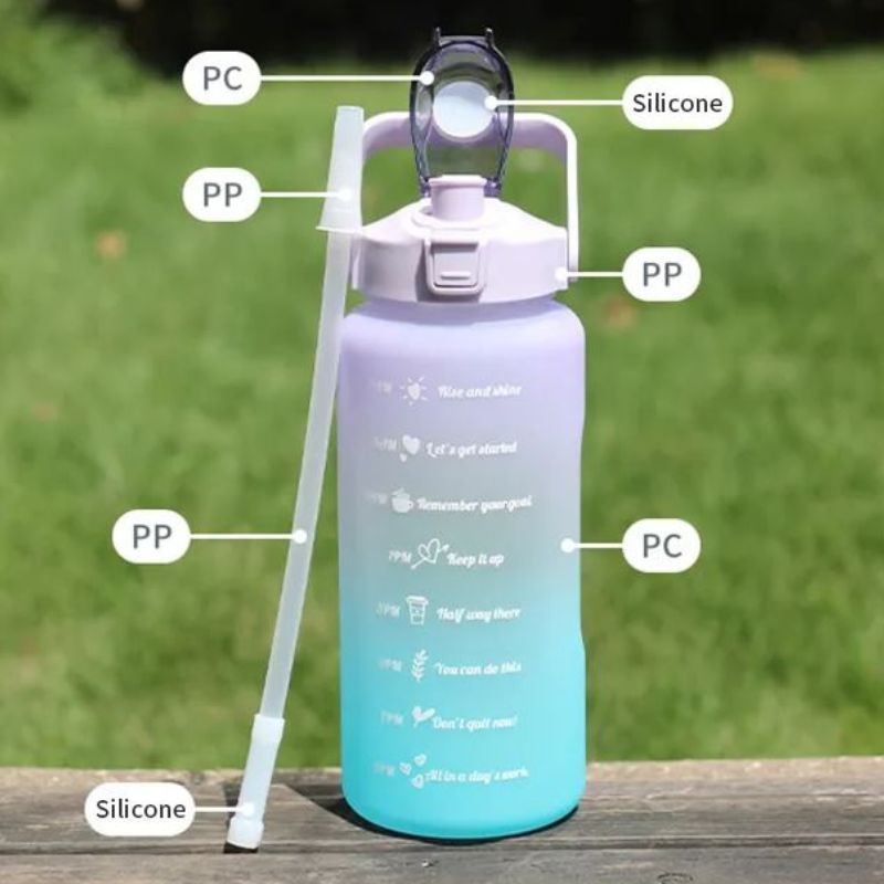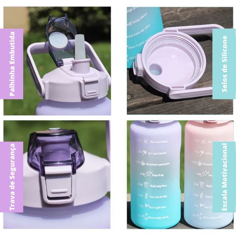 Cette bouteille sera votre meilleure motivation à boire de l'eau pendant la journée! Pendant la journée, il est nécessaire de rester hydraté et pour cela, il est très pratique d'avoir toujours une bouteille qui répond à nos besoins. Avec un design moderne, cette bouteille en plus d'être super colorée, il y a encore des phrases pour vous motiver à boire de l'eau dans certaines heures. Les marqueurs avec des phrases de motivation vous aideront à atteindre les objectifs et à boire le plus grand volume d'eau quotidienne dont notre corps a besoin pour rester hydraté. Cette bouteille a une paille en silicone douce pour protéger les gencives mais, si vous préférez, vous pouvez boire de l'eau en levant le couvercle. Il a également une poignée pour faciliter le transport, ce qui vous aidera sur la randonnée, les visites ou partout où vous voulez aller. Il devient parfait pour toute situation, que ce soit à l'école, au travail, au gymnase, aux voyages, au camping. Étant un produit réutilisable, il aide à préserver l'environnement en évitant l'utilisation de bouteilles en plastique et aide le bon fonctionnement de votre corps et améliore votre santé! Caractéristiques Matériau: plastique et silicone Capacité: 2 litres