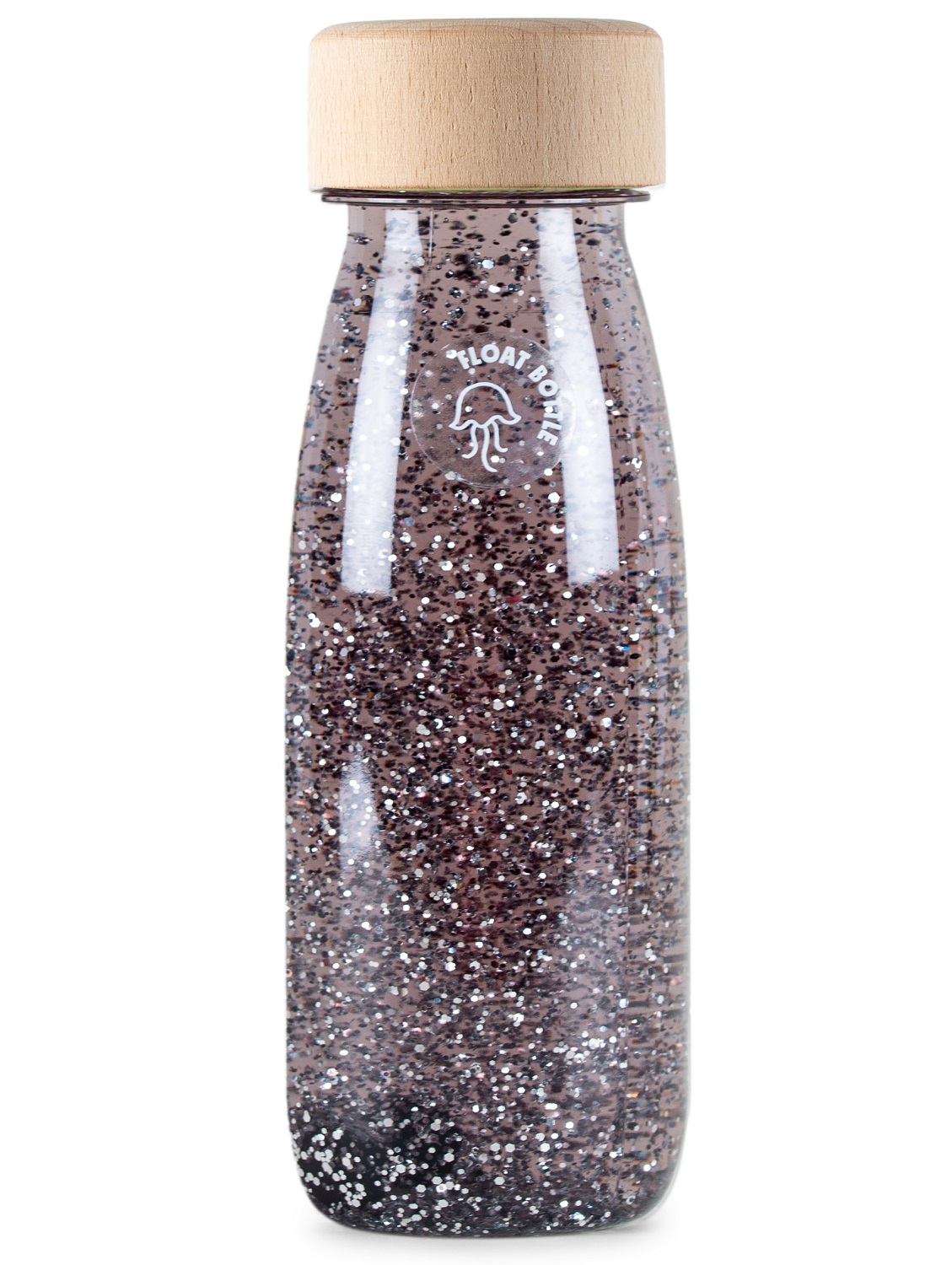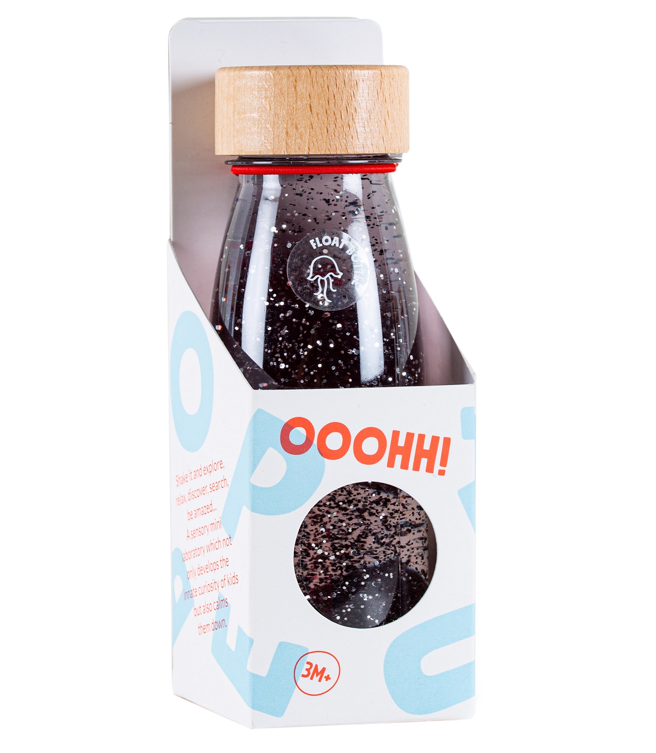 Découvrez la bouteille sensorielle Float Noir de la marque Petit Boum. Un jouet d’éveil inspiré de la pédagogie Montessori, qui stimule les sens des bébés dès 3 mois.