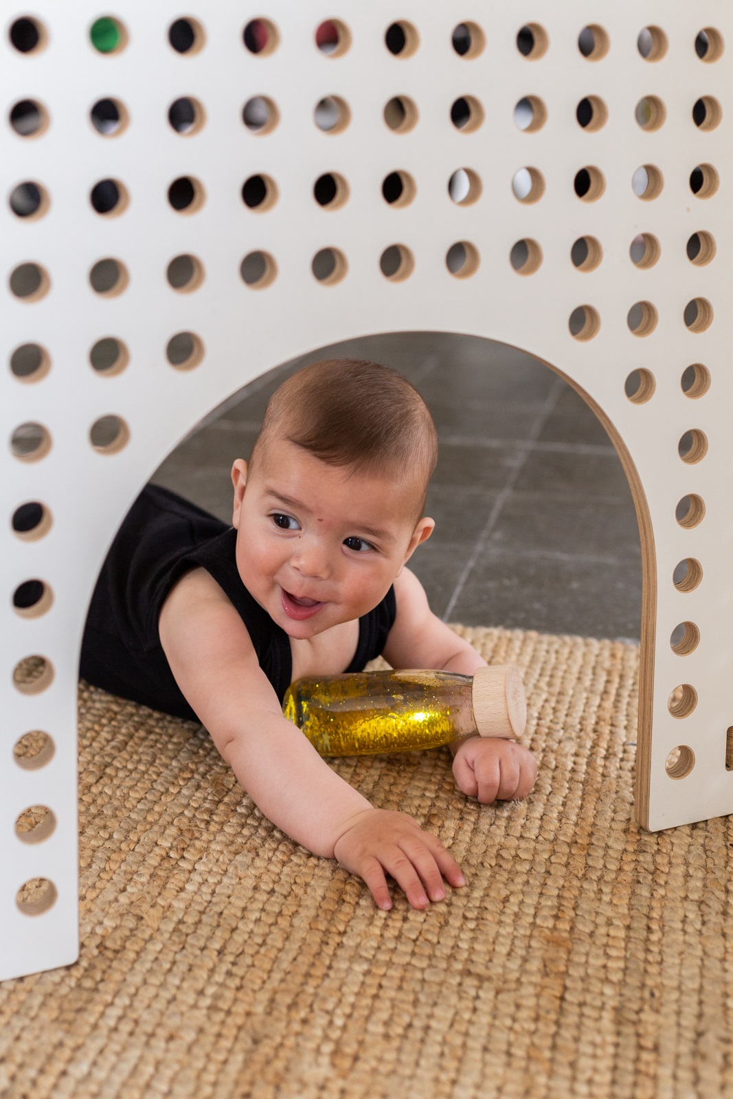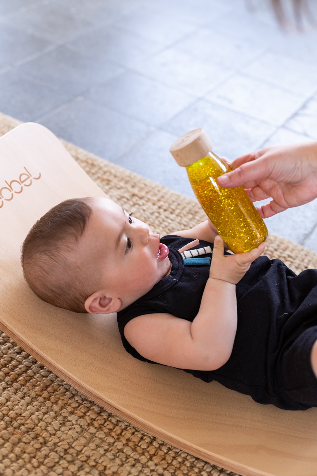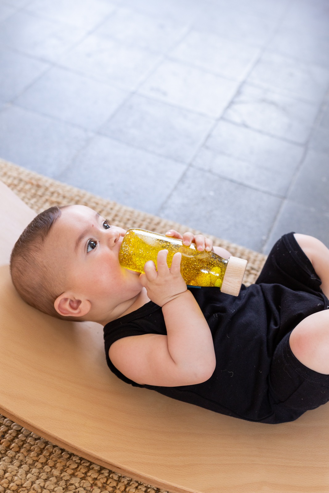 Découvrez la bouteille sensorielle Float or de la marque Petit Boum. Un jouet d’éveil coloré, inspiré de la pédagogie Montessori, qui stimule les sens des bébés dès 3 mois.