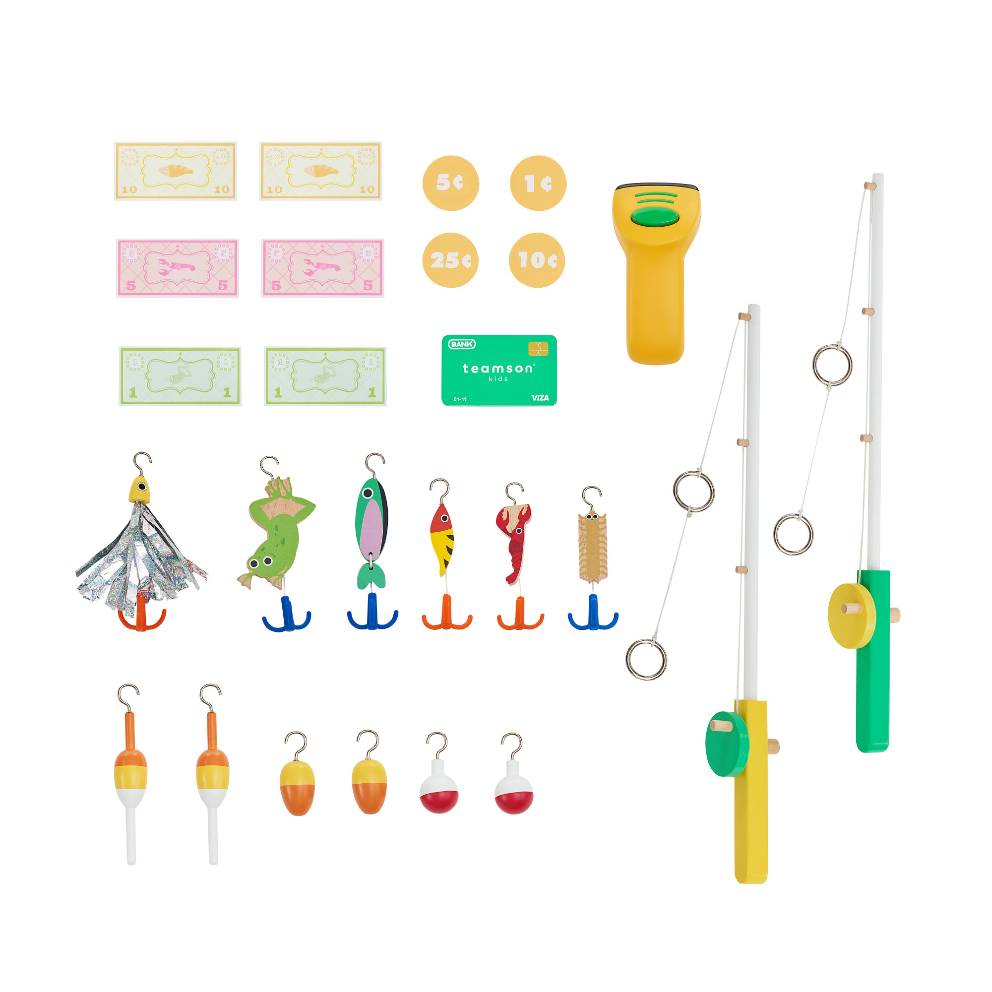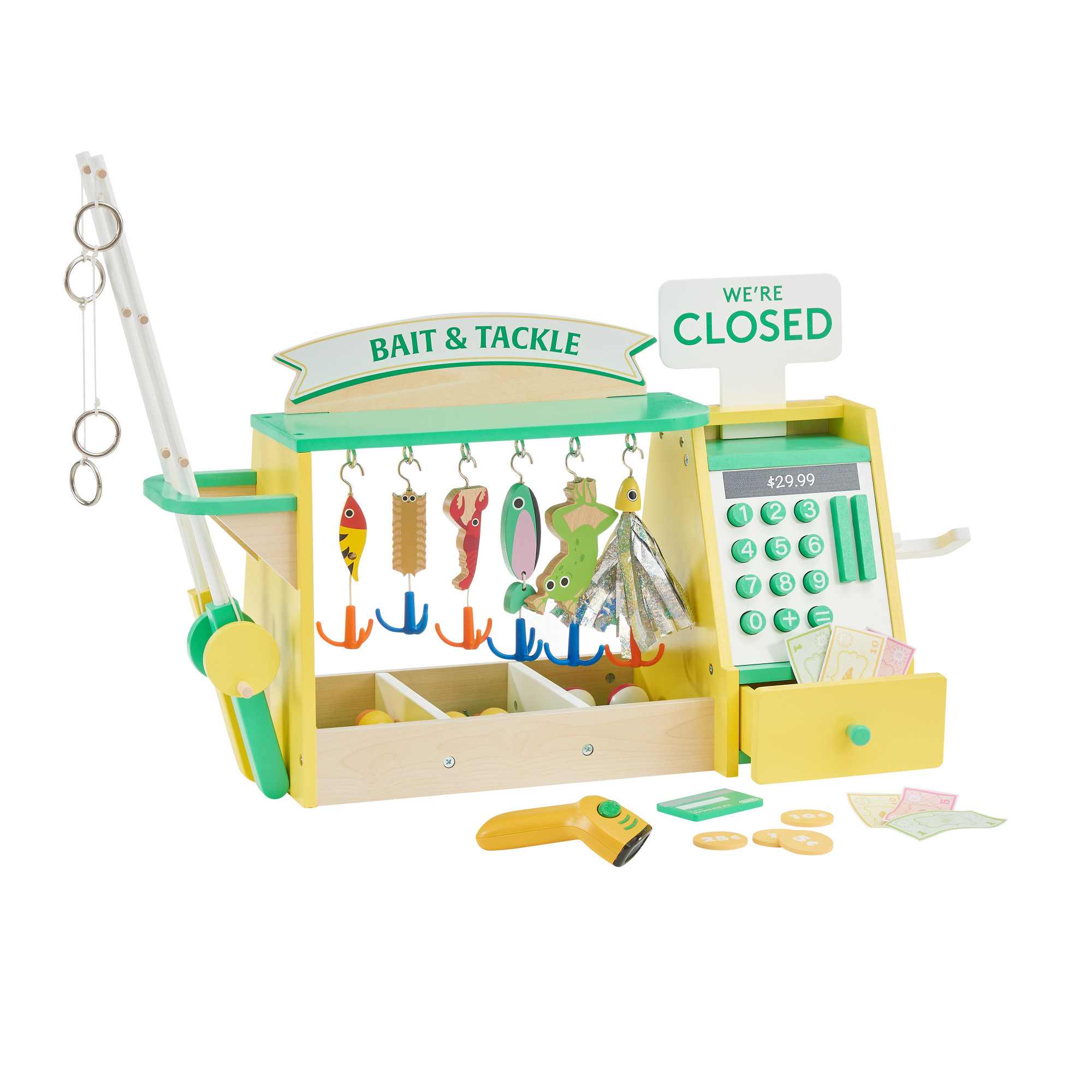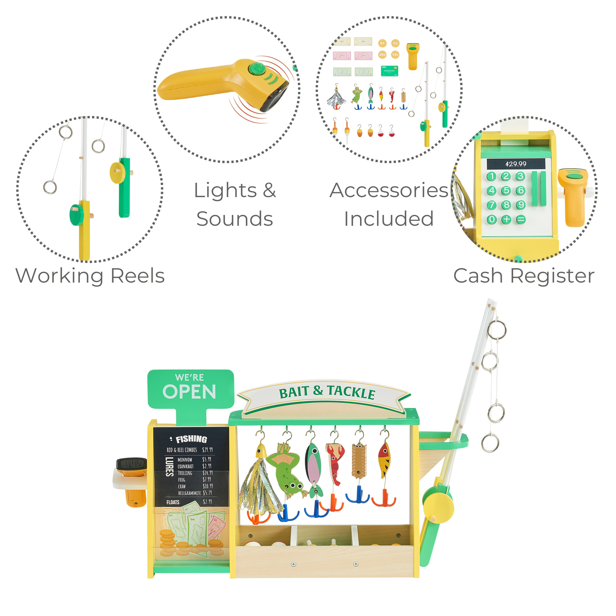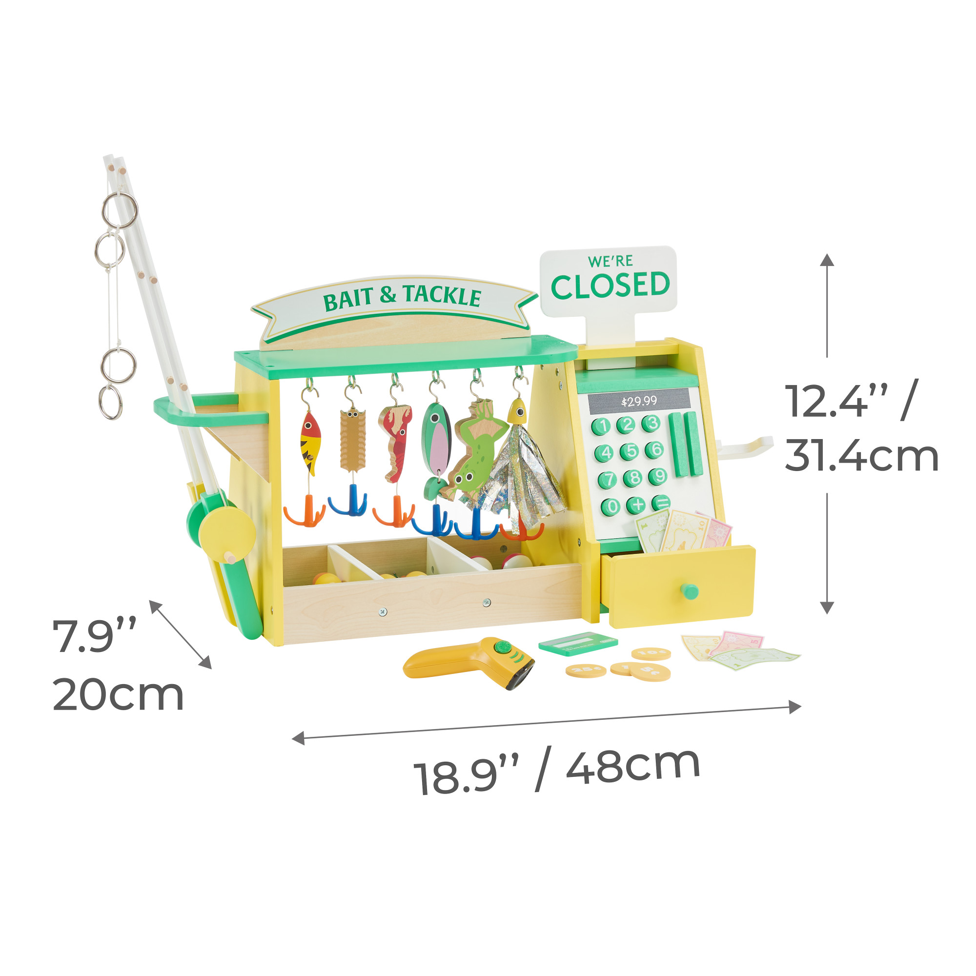 Amusez-vous à pêcher avec la boutique de pêche Teamson Kids My Little Helper. Cette boutique de pêche de table dispose d'une caisse enregistreuse fonctionnelle avec de l'argent fictif. Le panneau double face Ouvert/Fermé permet aux enfants de contrôler les heures d'ouverture, tandis qu'une paire de cannes à pêche avec moulinets leur permet de pratiquer leurs compétences de lancer. La boutique est équipée de six leurres colorés et de six flotteurs réalistes qui pendent des cannes à pêche. Un scanner jaune vif avec lumières et sons ajoute une touche d'interaction supplémentaire.