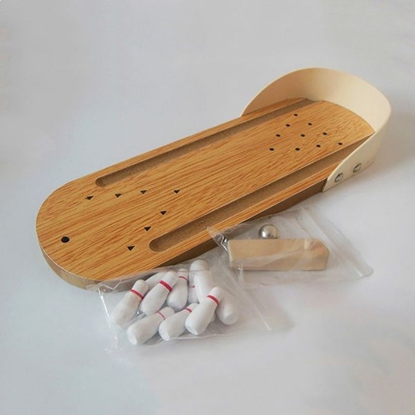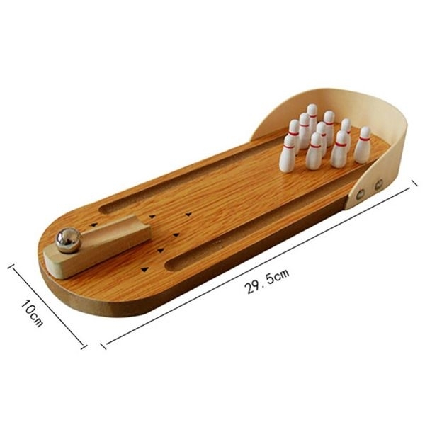 Grâce à ce jeu, vous allez pouvoir vous amuser pendant vos pauses au bureau. Il s'agit d'un mini bowling en bois. Ce plateau est accompagné de 10 quilles et d'une bille faite en métal. A offrir en cadeau à un proche.* Dimensions : 29,5 x 10 cm * Matière : bois et métal Fonctions : jeu bowling miniature Contenu : 1 piste de bowling en bois, 10 quilles, 1 bille métal.