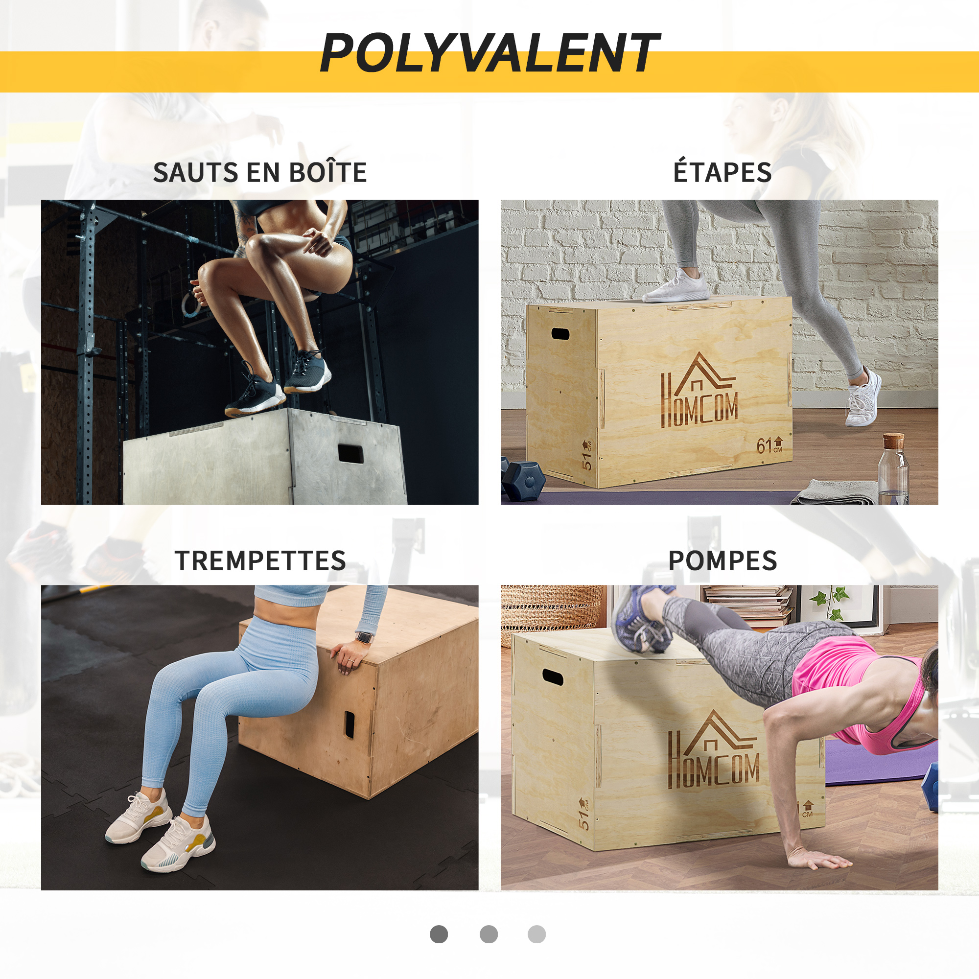 Box jump - box de pliométrie - boite de saut - 3 hauteurs 51/61/76H cm - charge max. 120 Kg - bois de hêt