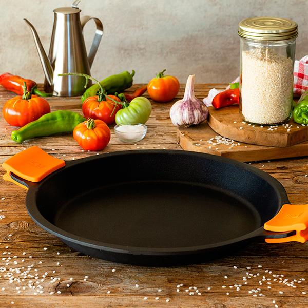La poêle Efficient réunit l'efficacité et la qualité pour une utilisation intensive en cuisine avec les meilleurs résultats. C'est une poêle robuste et durable grâce à son corps en aluminium coulé et à la qualité de son revêtement antiadhésif Platinum Plus, sans PFOA.Elle est adaptée à toutes les sources de chaleur (y compris l’induction) grâce à son fond diffuseur full induction. De plus, elle a une excellente distribution de la température pour une cuisson parfaite de toutes nos recettes.Elle comprend deux poignées en silicone orange pour une prise en main confortable de la poêle.C'est une poêle idéale non seulement pour préparer tous types de paellas et fideuás. Que ce soit une paella valencienne traditionnelle et savoureuse, un riz noir avec des petits pois et de la sèche, un riz du señorito ou une délicieuse fideuá avec sa finition parfaite au four. Sa grande surface antiadhésive vous permet également de l'utiliser comme plaque pour cuisiner rapidement et proprement, avec très peu d'huile, n'importe quel légume, le poisson du dîner ou la viande du repas pour toute la famille. Les filets de merlu ou de dorade, des tranches de brochet ou de thon, un calmar ou de petits calamars à l'ail et au persil, ou des moules seront parfaitement cuits. De la même manière, toute viande que vous souhaitez préparer à la poêle le sera : un peu de longe avec du sel et du poivre, un blanc de poulet saupoudré d'une pincée de thym ou un entrecôte de boeuf avec une touche de moutarde juste avant de servir dans l'assiette. Étant compatible avec le four, vous permet de rôtir des morceaux de poulet avec des pommes de terre sautées assaisonnées de vos herbes aromatiques préférées, de cuire n'importe quel poisson avec des légumes pour obtenir un plat très complet, et même de préparer une délicieuse tarte aux pommes feuilletée ou une tourte au thon et aux poivrons. Grâce à son antiadhésif, vous pourrez cuire n'importe quel aliment avec très peu d'huile et sans qu'il colle, de manière très efficace. Et de plus, il est très facile et confortable à nettoyer.CaractéristiquesFabriquée en aluminium coulé extrêmement résistant à la déformation (6 mm d'épaisseur à la base).Revêtement antiadhésif Teflon Platinum Plus de haute qualité et très durable. 100 % sans PFOA.Fond full induction compatible avec toutes les sources de chaleur, y compris l'induction.Adaptée pour une utilisation au four jusqu'à 220°C sans poignées ni couvercle.DimensionsDiamètre supérieurDiamètre de baseHauteurPortions32 cm25,4 cm4,1 cm2-3 portions36 cm27,4 cm4,1 cm4-5 portions40 cm29,5 cm4,6 cm5-6 portions