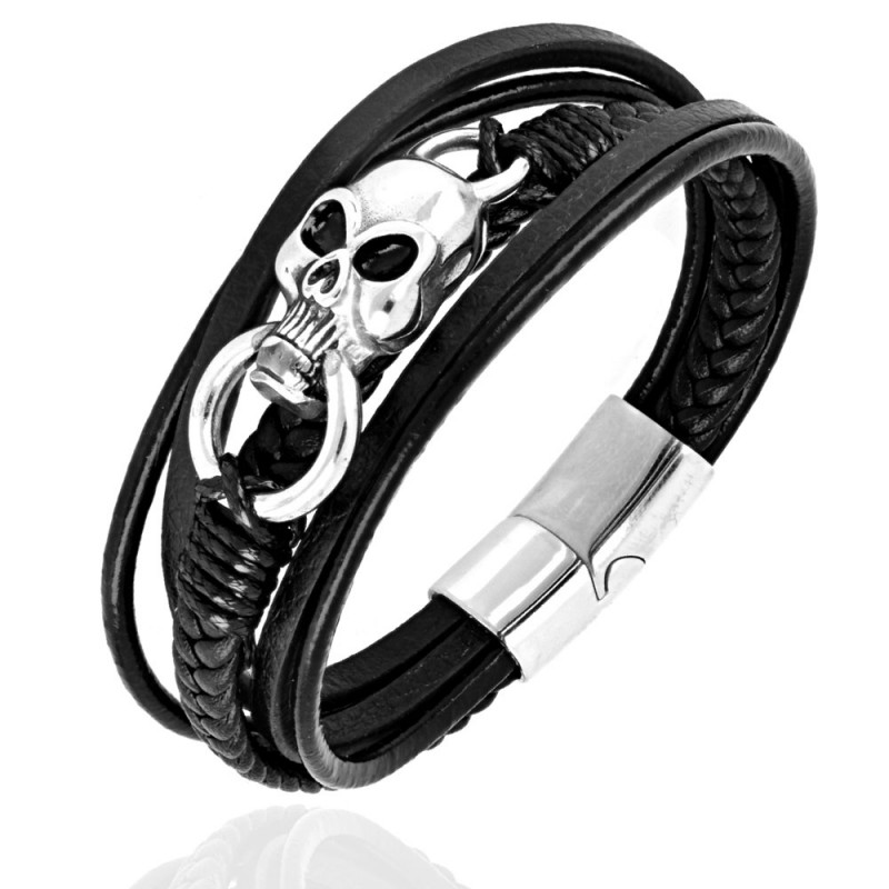 Libellé Bracelet Acier et Cuir - Tête de Mort - Homme
