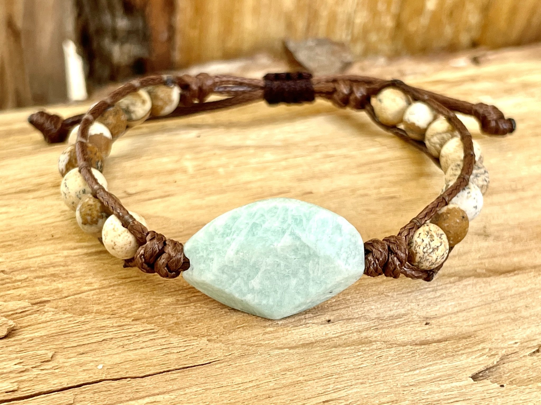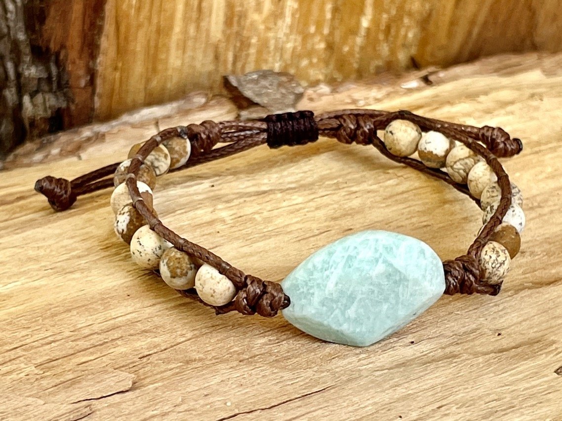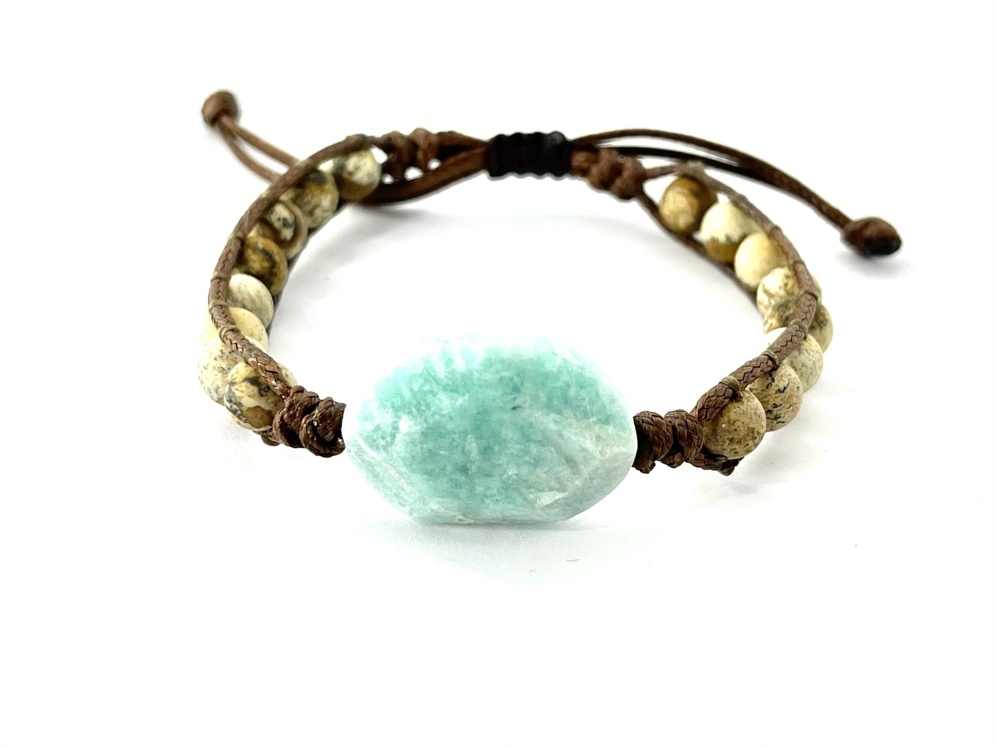Ce Bracelet Amérindien est une création magnifique de grande qualité composée de Jaspe , d'amazonite et de cuir véritable. Il est réalisé à la main avec un soin particulier et conçu pour être ajustable afin de convenir à la plupart des poignets.