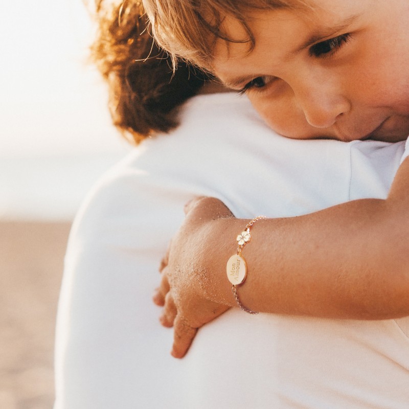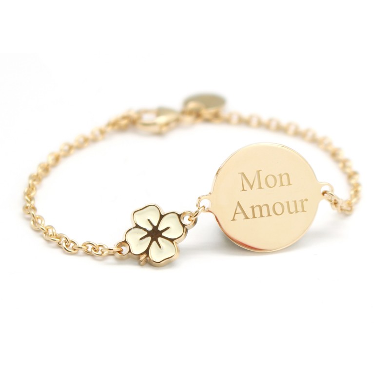 Libellé Bracelet chaine médaille trèfle laqué plaqué or enfant - gravure MON AMOUR