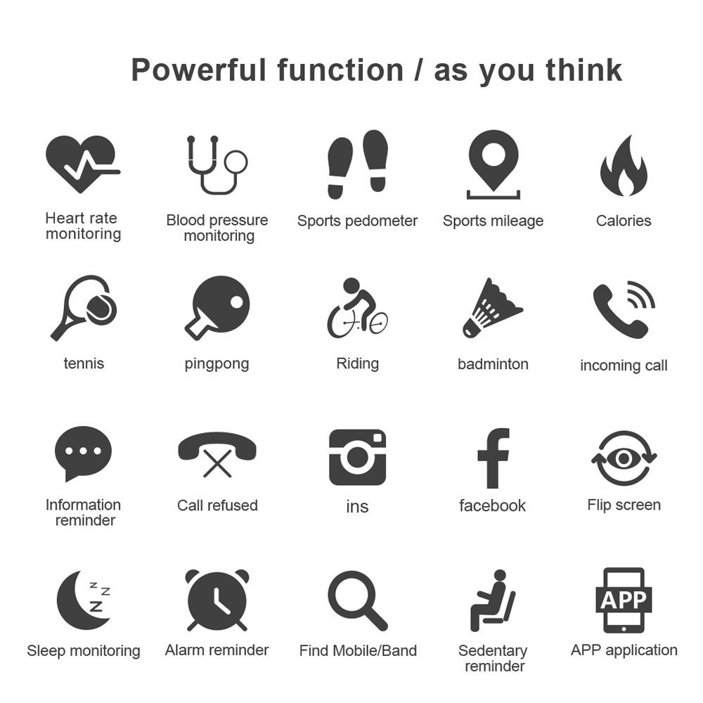- Fonctionnalités : lever de main pour illuminer l'écran, rappel d'appel, suivi de la fréquence cardiaque, mesure de la pression artérielle, alarme, podomètre, fonction de recherche du bracelet, suivi du sommeil, notifications QQ\WeChat\Facebook, WhatsApp, etc., rappel de sédentarité, chargement USB