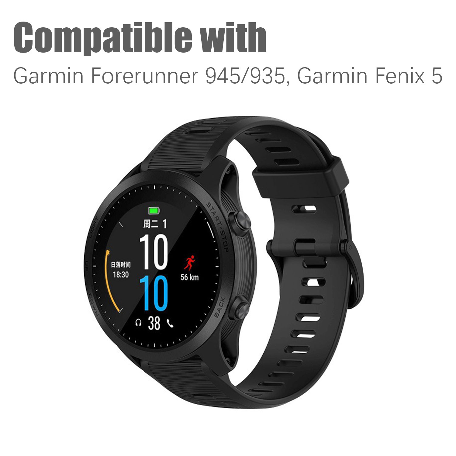 Le bracelet de sport souple et durable est en silicone résistant à l'eau. Le bracelet mesure 22 mm de large et s'adapte aux Garmin Forerunner 945/935 et Garmin Fenix 5. Le bracelet est facile à changer, outils inclus.