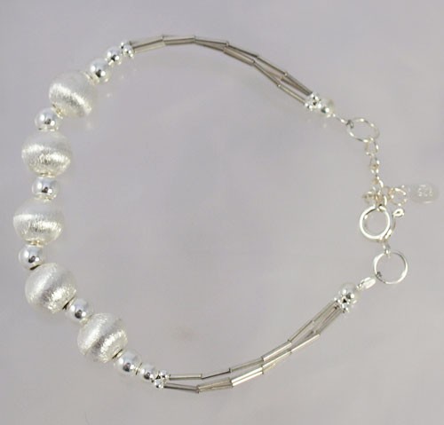 bracelet original pour femme ou jeune fille. Bracelet souple, composé de 3 grosses perles en argent brossé et intercalé de petites perles en argent lisse. L'ensemble est relié par un double filin en argent.longueur : 20cm - Largeur : 10cm - Poids : 11gr