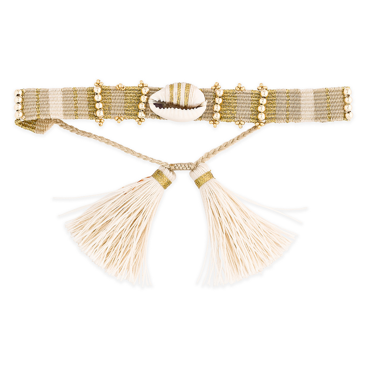 Bracelet tissé en coton délicat beige, blanc et doré, décoré d'un coquillage cowrie naturel lui-même rebrodé de fils crème et or.