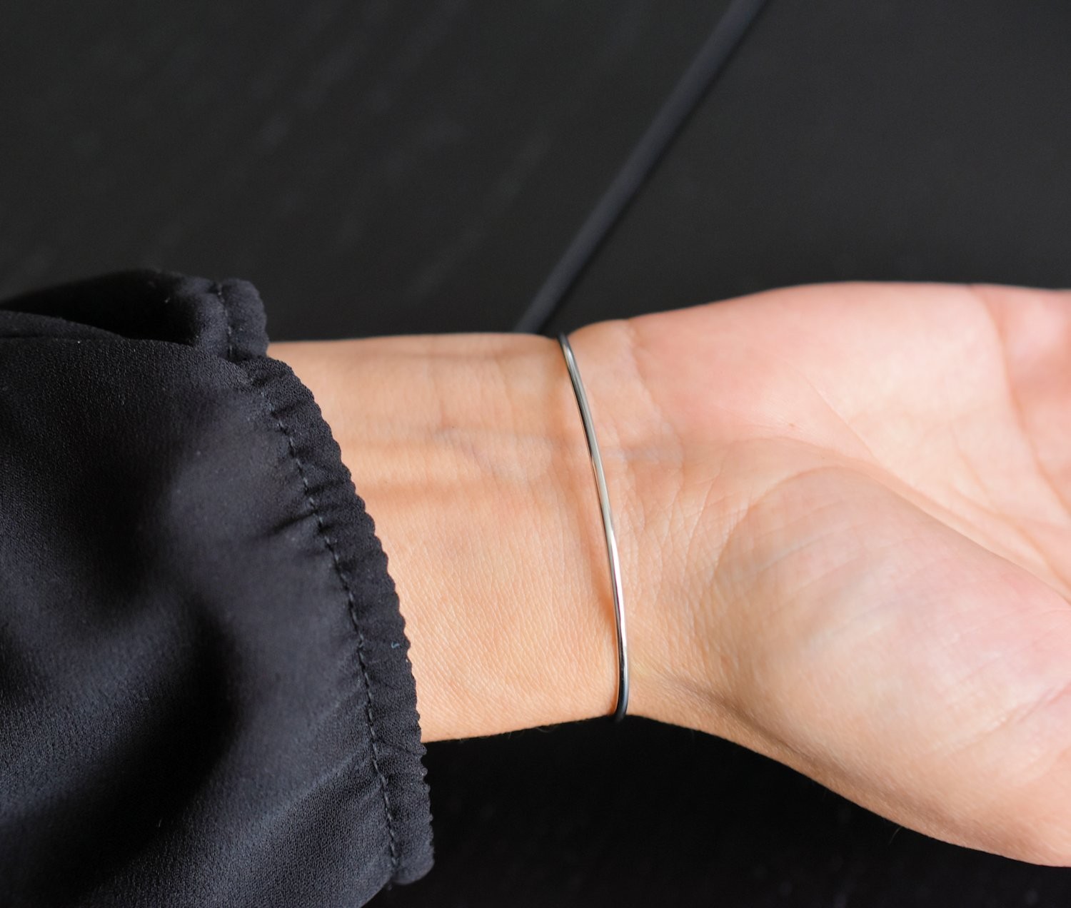 Le bracelet est conçu sous la forme d'un jonc rigide ouvert, ce qui facilite son enfilage et son ajustement à votre poignet.