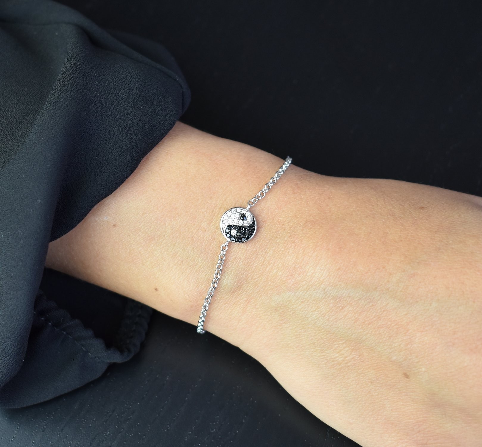 Bracelet yin yang serti d'oxydes de zirconium blancs et noirs Argent 925 Rhodié