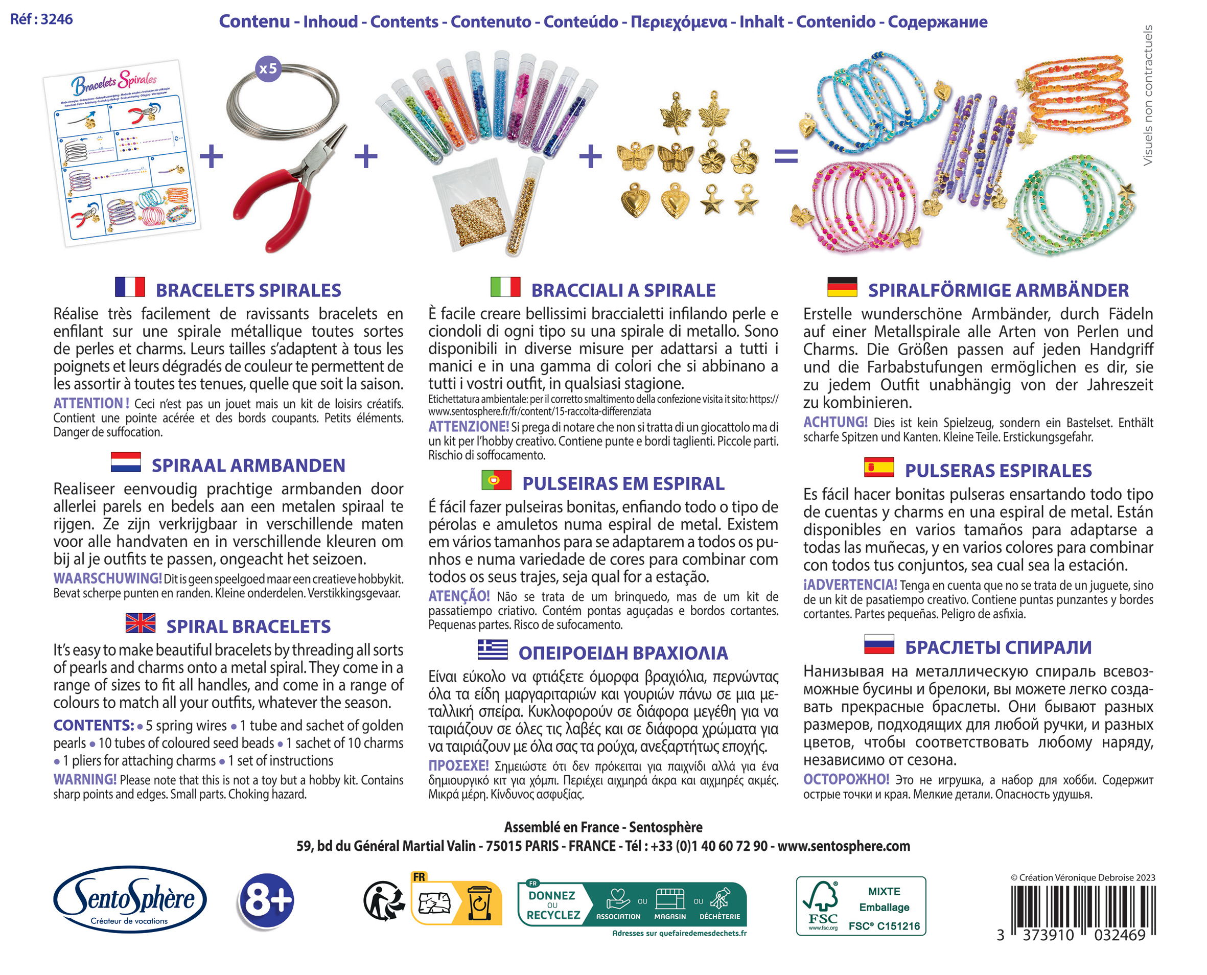 | Plus produit | Réalisez très facilement des bracelets tendances en forme de spirales : les différentes couleurs et formes de perles fournies permettront de faire de jolies dégradés de couleurs, tandis que les charms offriront une jolie finition au bracelet. Leurs tailles s'adaptent à tous les poignets et ils pourront s'assortir à toutes les tenues, quelque soit la saison ! |