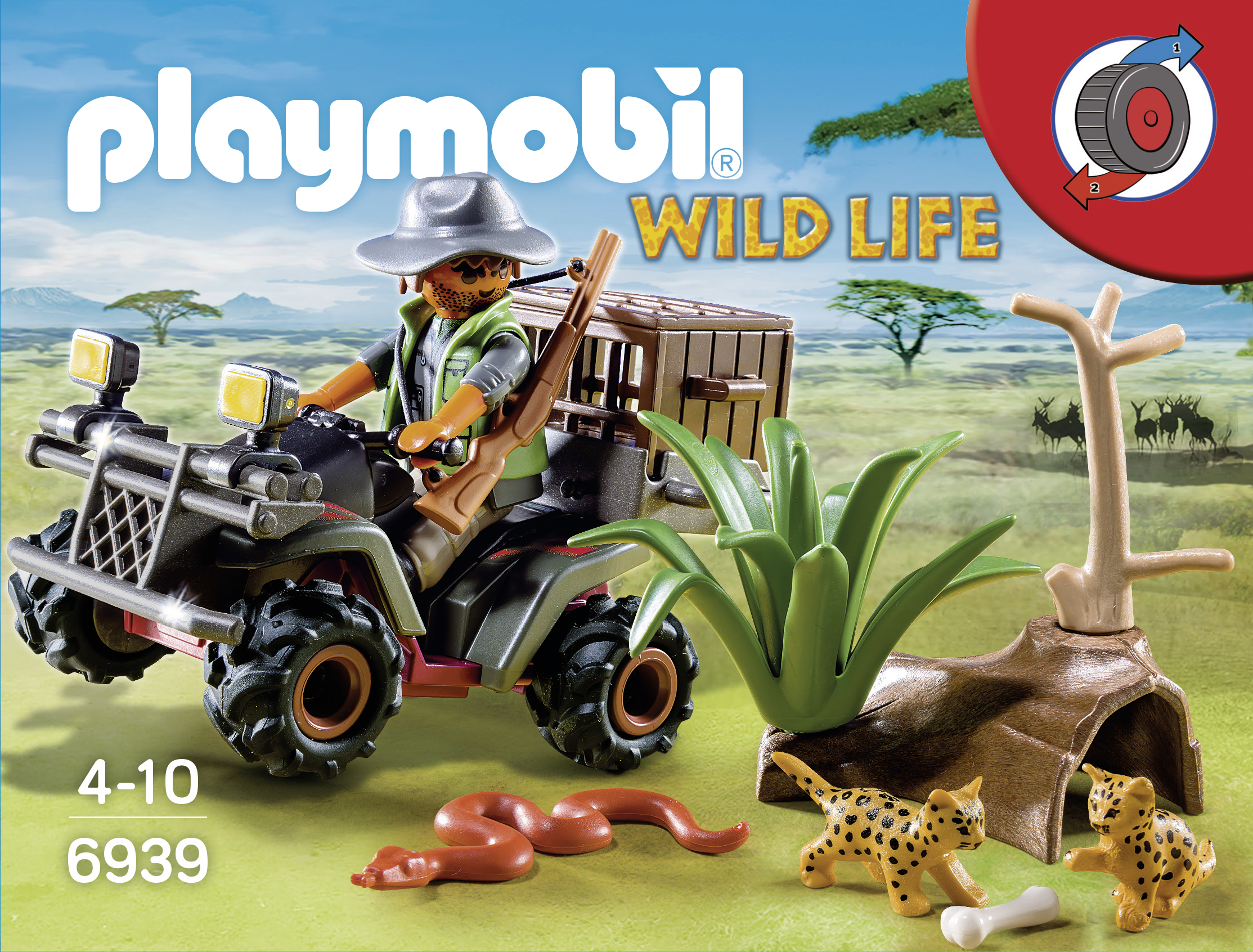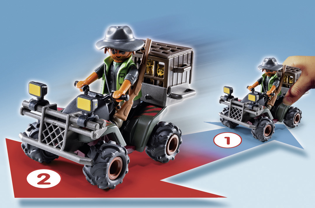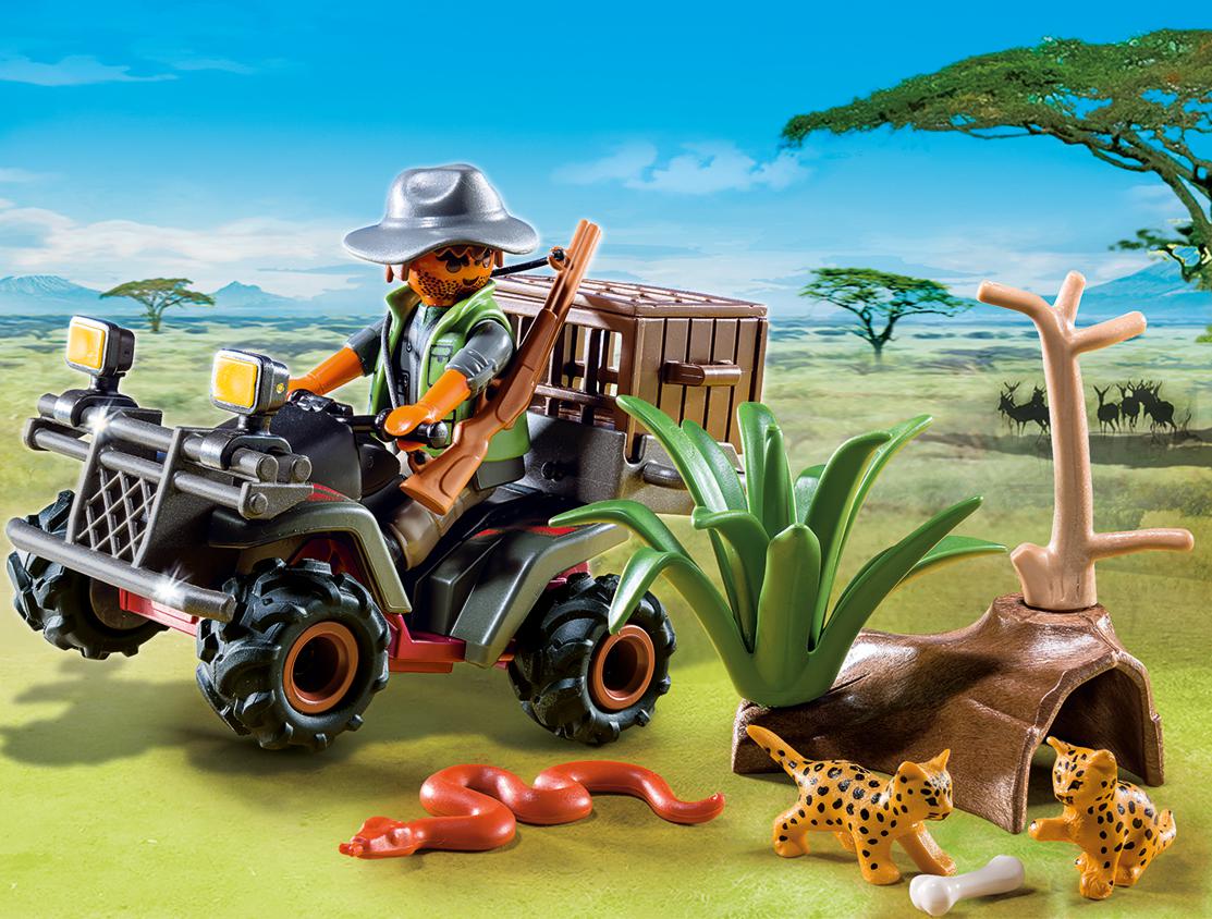 Un personnage, un quad, des animaux (serpent, bébés léopards...) et des accessoires (fusil, caisse, os...). Le quad est équipé d’un moteur à rétro-friction.