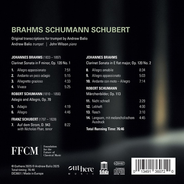 Avec Haendel et Bach, la trompette était destinée à un futur brillant, mais l'histoire en décida autrement. Utilisée principalement pour son côté martial, elle dû attendre la fin de l'ère romantique pour être à nouveau considérée. Dans cet album qu'il a imaginé, Andrew Balio interprète ses transcriptions d'oeuvres issues de l'âge d'or de la musique de chambre et tire ainsi les trompettistes de leur solitude en les invitant dans le monde douillet de Brahms, Schumann et Schubert. Le pianiste John Wilson accompagne Andrew dans ces nouveaux arrangements des sonates pour clarinette de Brahms, de l'Adagio et Allegro, et des Märchenbilder de Schumann et du lied « Auf dem Strom » de Schubert, dont le texte est chanté par le ténor Nicholas Phan. Grâce à Andrew, les trompettistes et autres amoureux de musique pourront bénéficier d'un répertoire plus large et découvrir un monde sonore complètement nouveau.