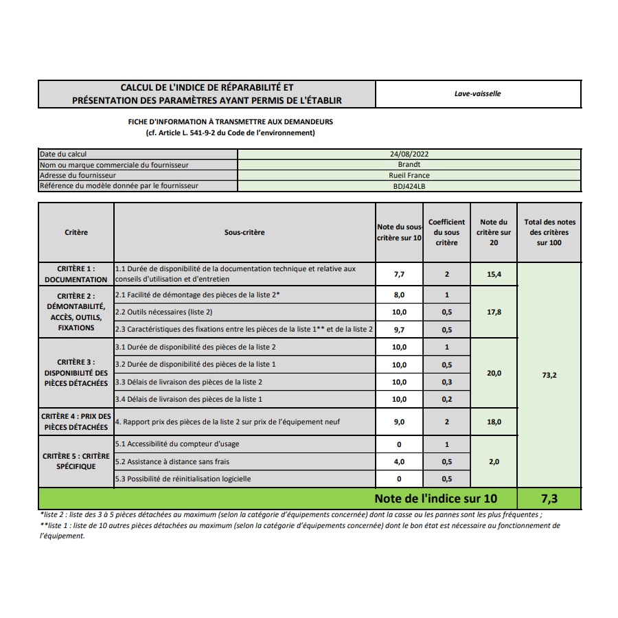 Indice de réparabilité 7,3 / 10