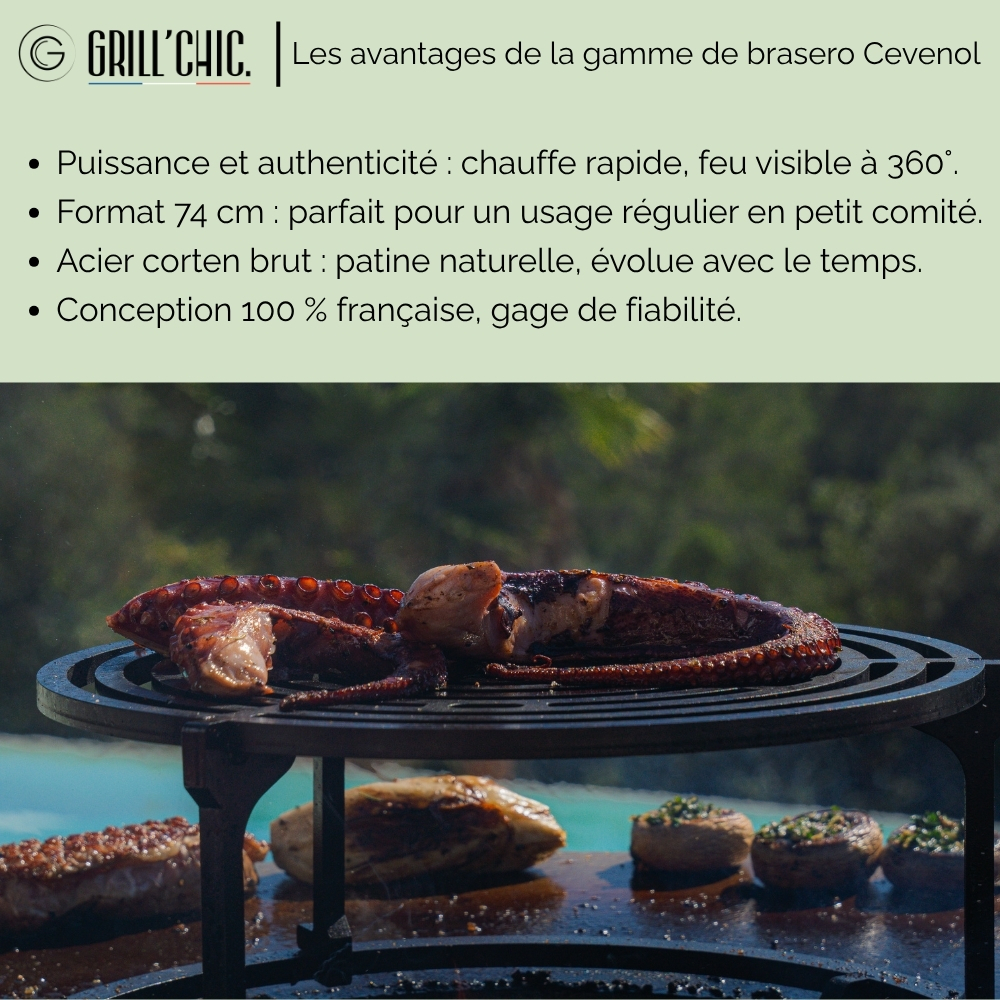 DESCRIPTION DU PRODUIT Le brasero plancha CEVENOL Simple Cuve Corten de Grill’Chic combine esthétisme brut et performance culinaire pour des moments chaleureux en extérieur. Conçu en acier Corten 2 mm, il se distingue par sa robustesse et son élégante patine naturelle qui évolue avec le temps. Sa cuve simple accueille une plaque de cuisson emboutie en acier de 8 mm d’épaisseur, garantissant une diffusion homogène de la chaleur pour des cuissons maîtrisées. Ce modèle est décliné en plusieurs formats (ronds ou carrés) pour s’adapter aux différents espaces, avec la possibilité d’ajouter un rangement bois intégré pour plus de praticité. Fabriqué en France, ce brasero est garanti 2 ans et s’intègre parfaitement dans un jardin, sur une terrasse ou au bord d’une piscine. AVANTAGES DU PRODUIT Le CEVENOL mise sur la simplicité fonctionnelle et la qualité de fabrication. L’acier Corten utilisé lui assure une grande durabilité et un design authentique, sans traitement supplémentaire. Sa plaque de cuisson épaisse permet de saisir viandes, poissons et légumes à la perfection. Le format simple cuve est idéal pour une utilisation régulière avec un entretien facilité. Ses quatre pieds réglables garantissent une excellente stabilité, même sur des surfaces irrégulières. Disponible avec ou sans espace de rangement pour le bois, le brasero CEVENOL s’adapte à vos envies d’aménagement extérieur tout en assurant performance et convivialité. CARACTÉRISTIQUES TECHNIQUES : - Dimensions (LxPxH) : Ø74 x 90 cm - Dimensions du meuble : 40 x 40 x 68 cm - Surface de cuisson : 0,35 m² - Épaisseur plaque cuisson : 8 mm - Épaisseur tôle châssis : 2 mm - Épaisseur tôle cuve : 2 mm - Poids total : 51,6 kg - Poids plaque cuisson : 21,8 kg - Poids châssis cuve : 29,8 kg - Matériau châssis : Acier Corten (effet rouillé – possibles coulures aux premières pluies) - Matériau cuve : Acier Corten (effet rouillé – possibles coulures aux premières pluies) - Matériau
