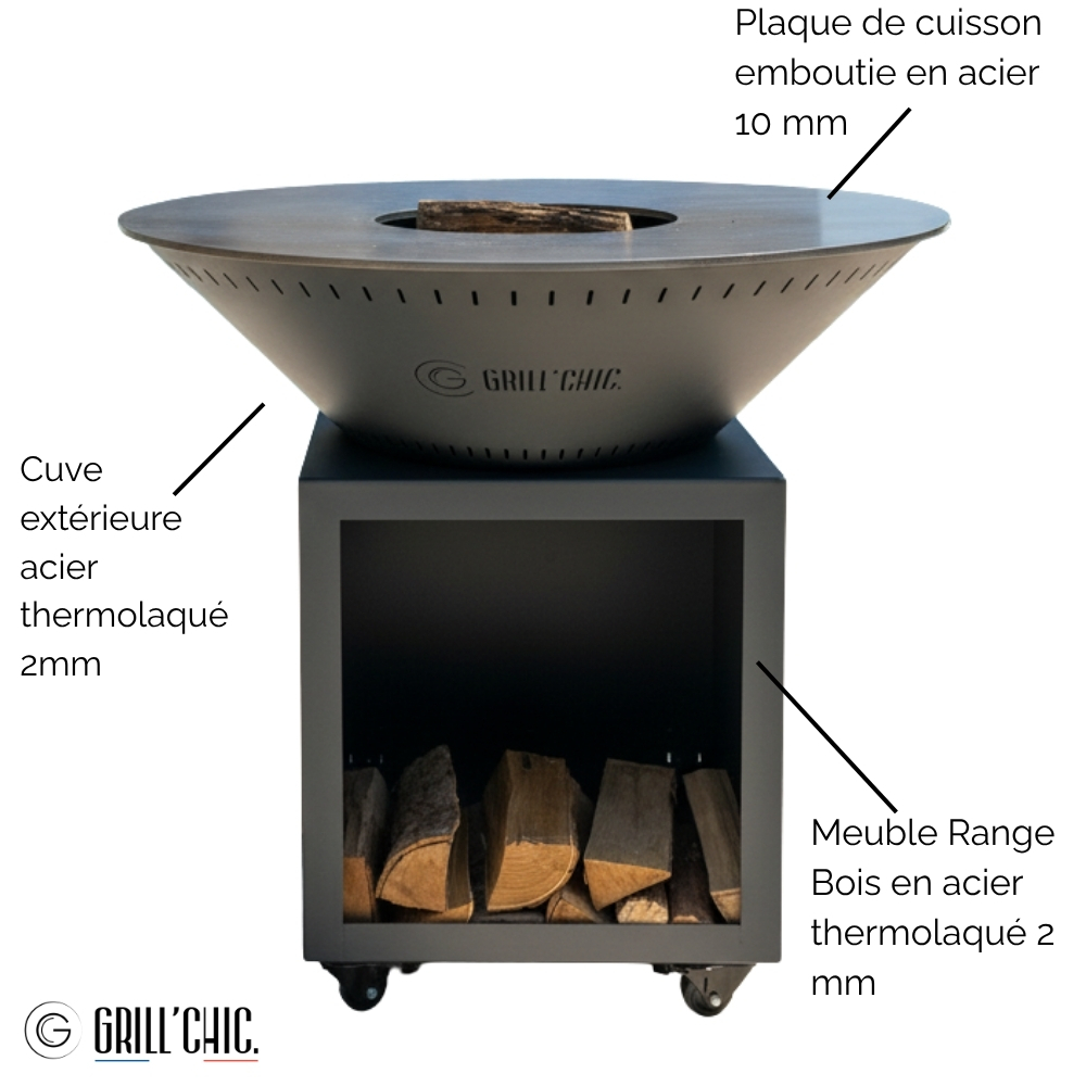 Le brasero plancha barbecue CLASSIQUE Double Cuve Acier de GRILL CHIC est une pièce d’exception, fabriquée en France. Disponible en 2 tailles (Ø 83 cm ou 103 cm, hauteur 90 cm) et 4 coloris, il allie esthétisme et performance. Sa double cuve (acier Corten 2 mm, acier thermolaqué 3 mm ou aluminium thermolaqué 3 mm) permet une cuisson efficace et sécurisée, avec une plaque emboutie en acier de 10 mm pour une chaleur uniformément répartie.