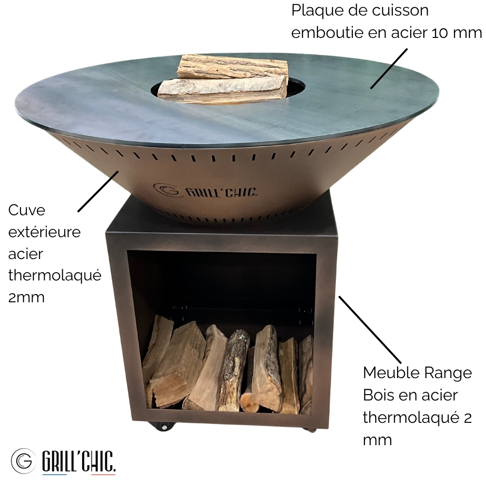 Le brasero plancha barbecue CLASSIQUE Double Cuve Acier de GRILL CHIC est une pièce d’exception, fabriquée en France. Disponible en 2 tailles (Ø 83 cm ou 103 cm, hauteur 90 cm) et 4 coloris, il allie esthétisme et performance. Sa double cuve (acier Corten 2 mm, acier thermolaqué 3 mm ou aluminium thermolaqué 3 mm) permet une cuisson efficace et sécurisée, avec une plaque emboutie en acier de 10 mm pour une chaleur uniformément répartie.