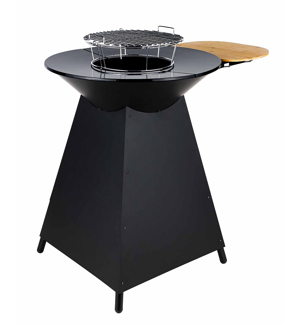 Braséro barbecue, cuve acier Ø 70 cm sur socle acier, grille de cuisson acier chromé, tablette bambou rabattable, plaque en fonte émaillée ( en 2 parties) amovible