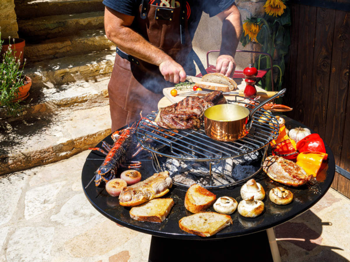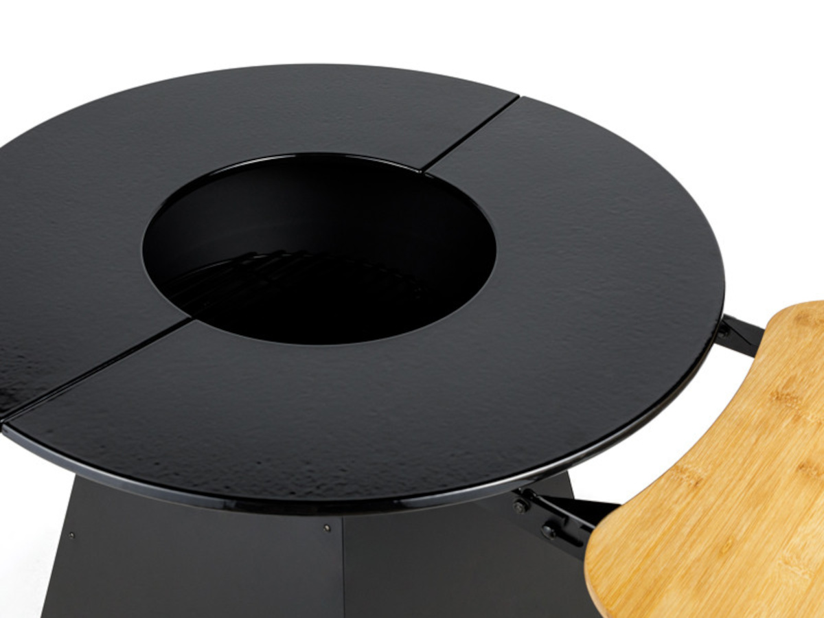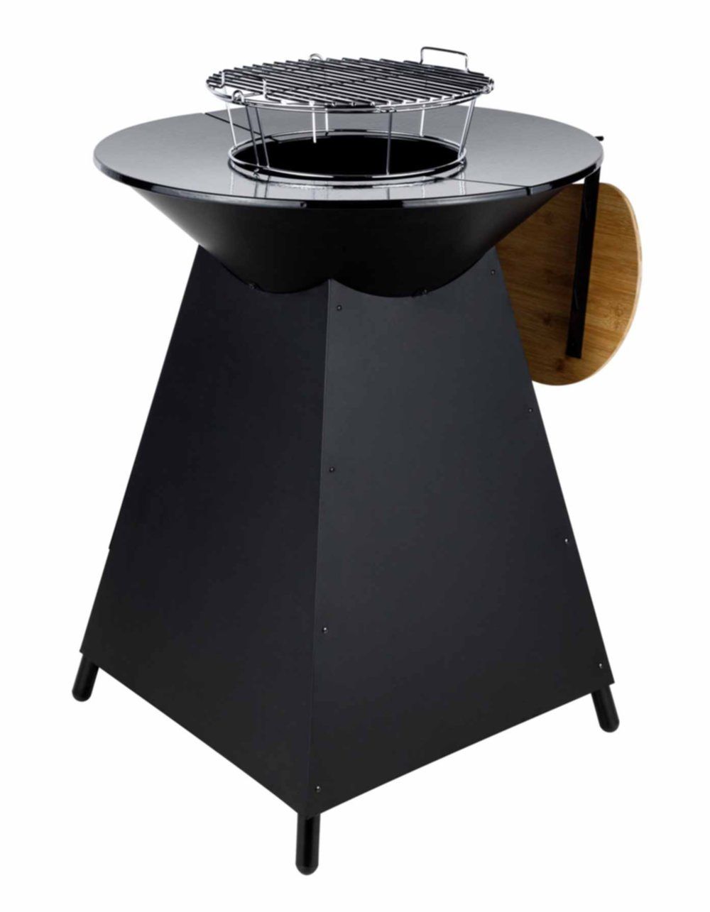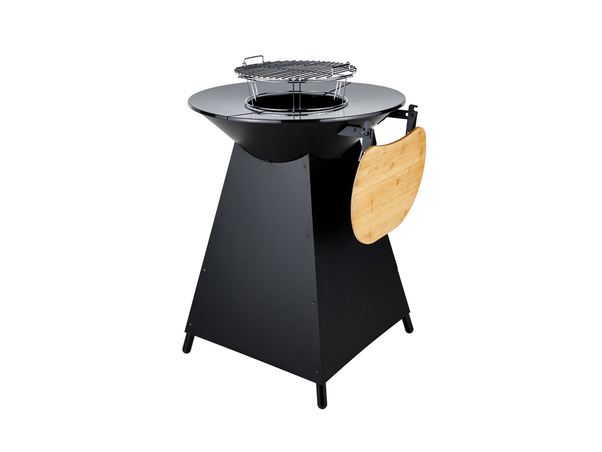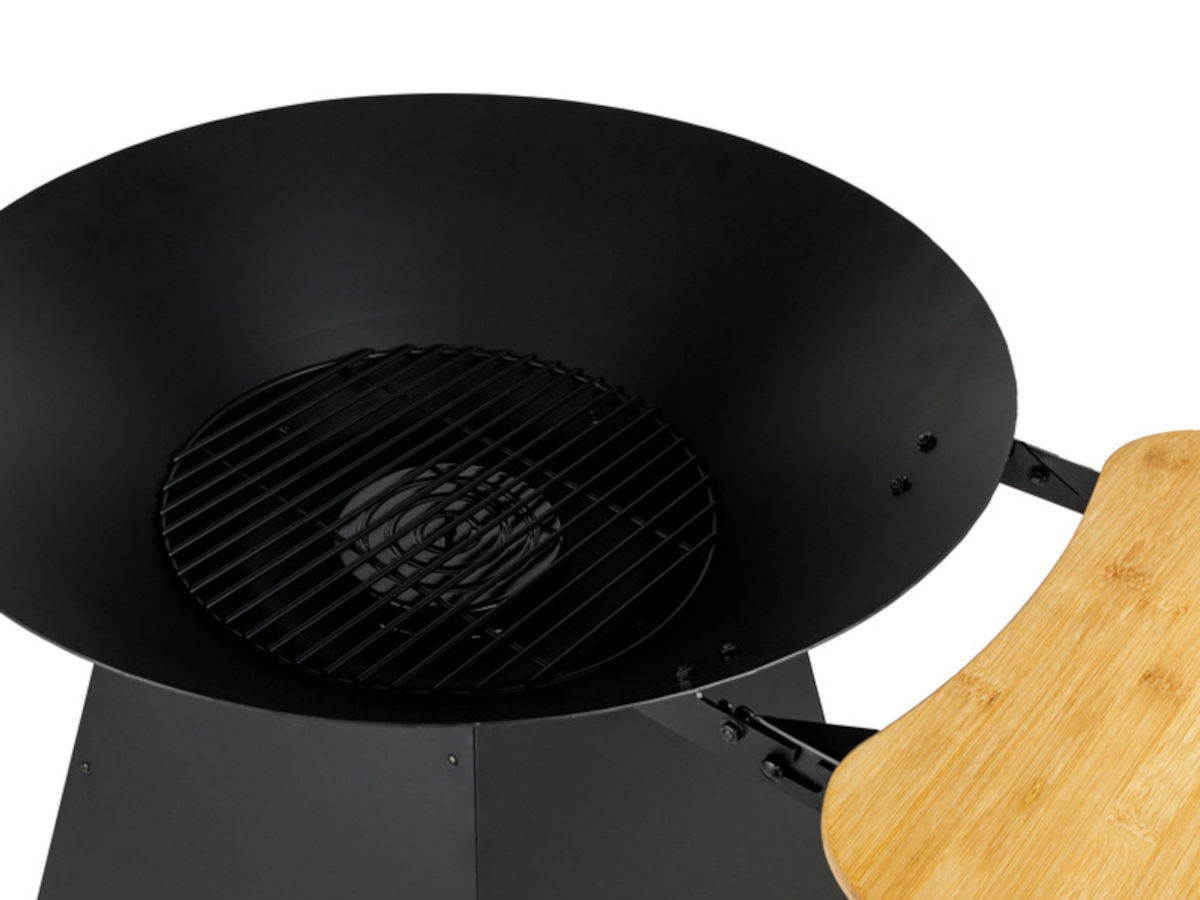 Braséro barbecue, cuve acier Ø 70 cm sur socle acier, grille de cuisson acier chromé, tablette bambou rabattable, plaque en fonte émaillée ( en 2 parties) amovible