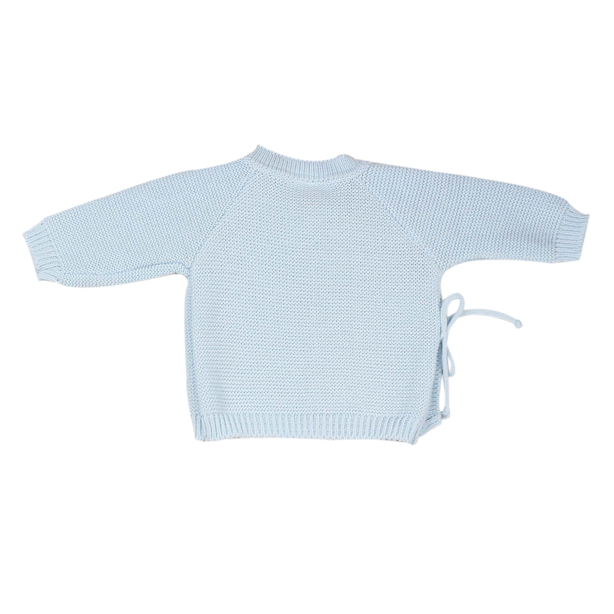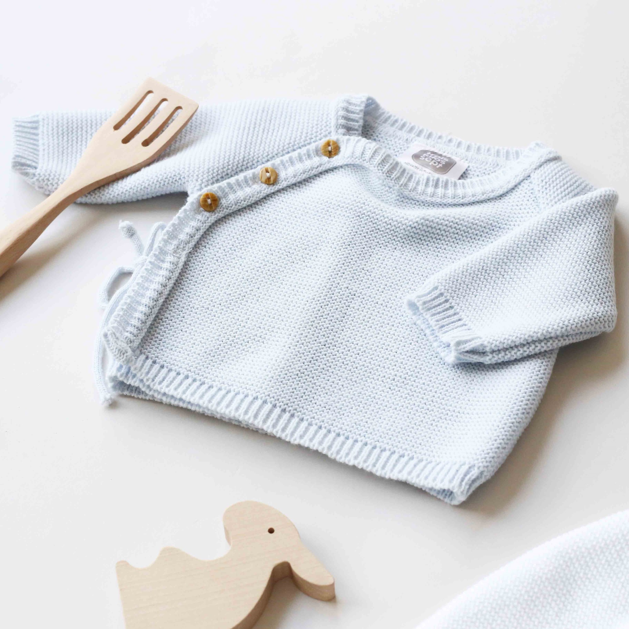 Cette brassière réchauffera bébé les premiers jours après la naissance. Elle est de taille unique 0/1 mois. Elle dispose d'un col cache-cœur avec des boutons bois et des liens à nouer. Elle est en maille 100% acrylique.