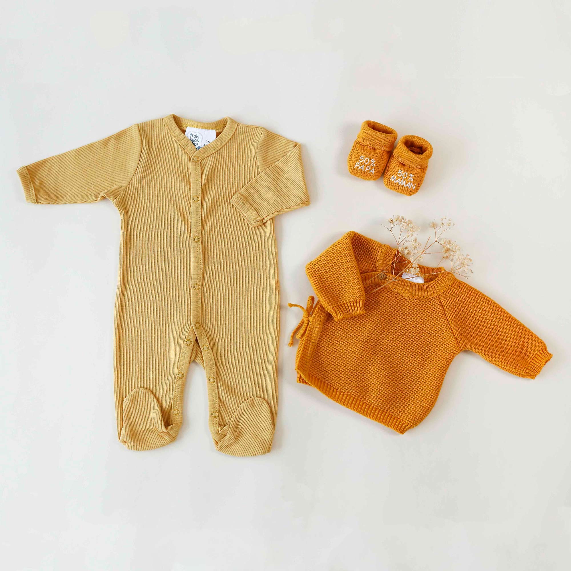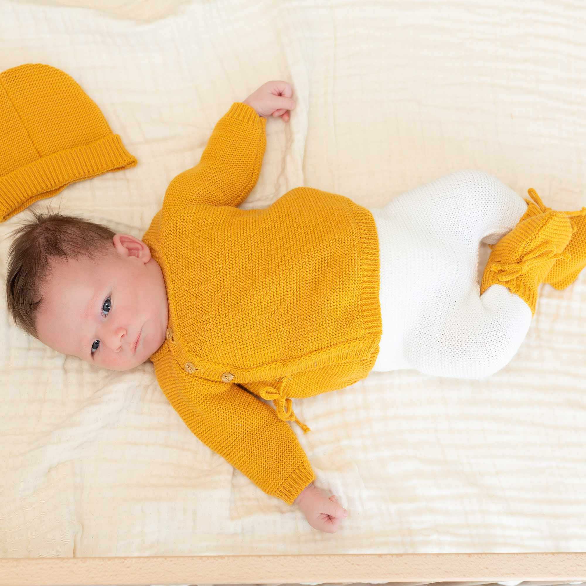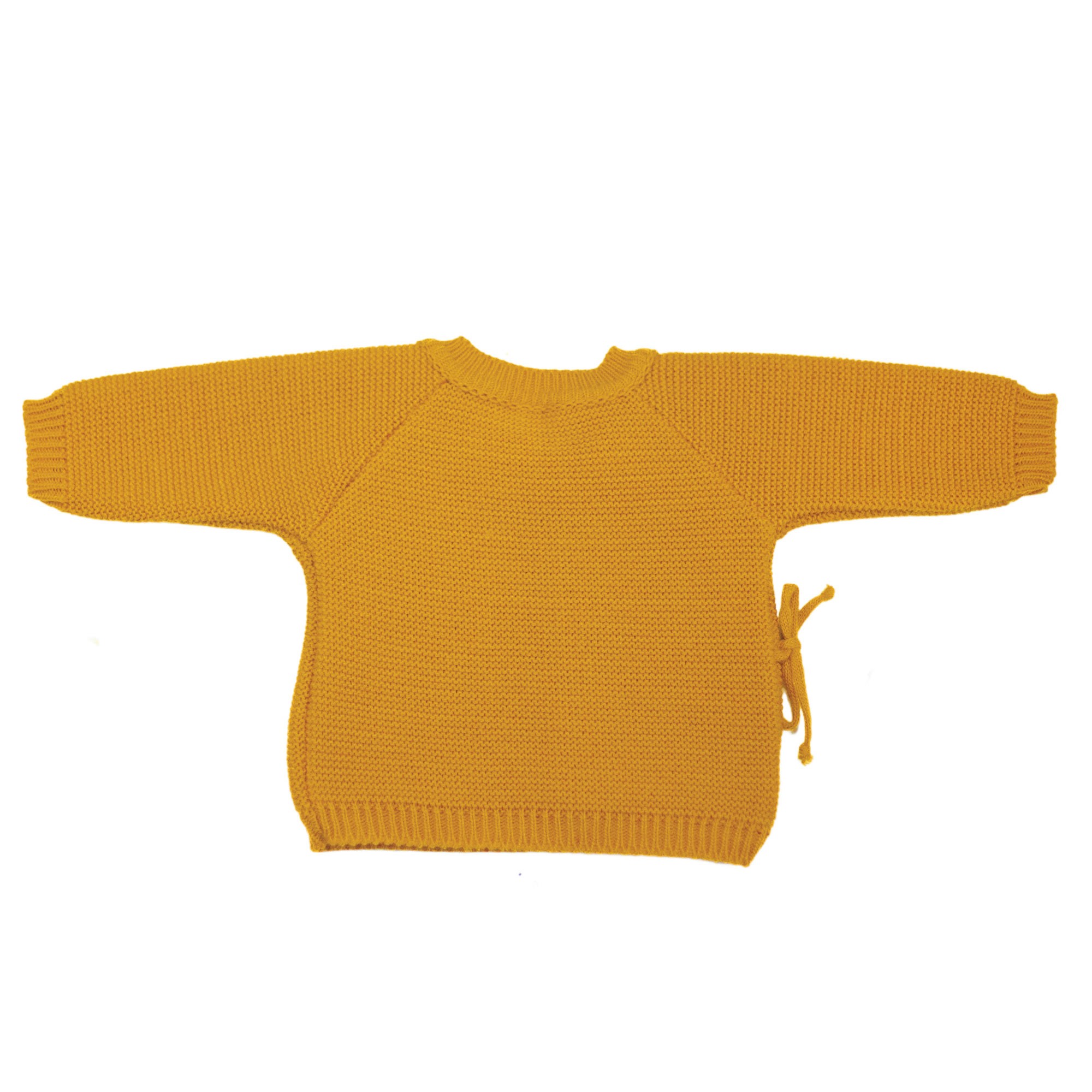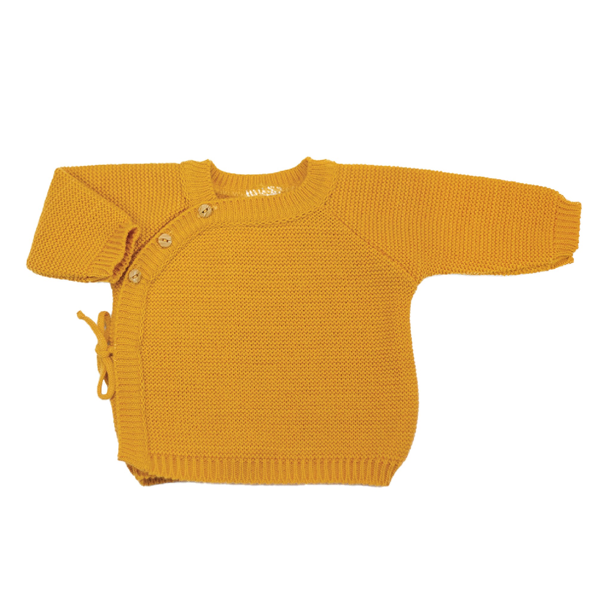 Cette brassière réchauffera bébé les premiers jours après la naissance. Elle est de taille unique 0/1 mois. Elle dispose d'un col cache-cœur avec des boutons bois et des liens à nouer. Elle est en maille 100% acrylique.