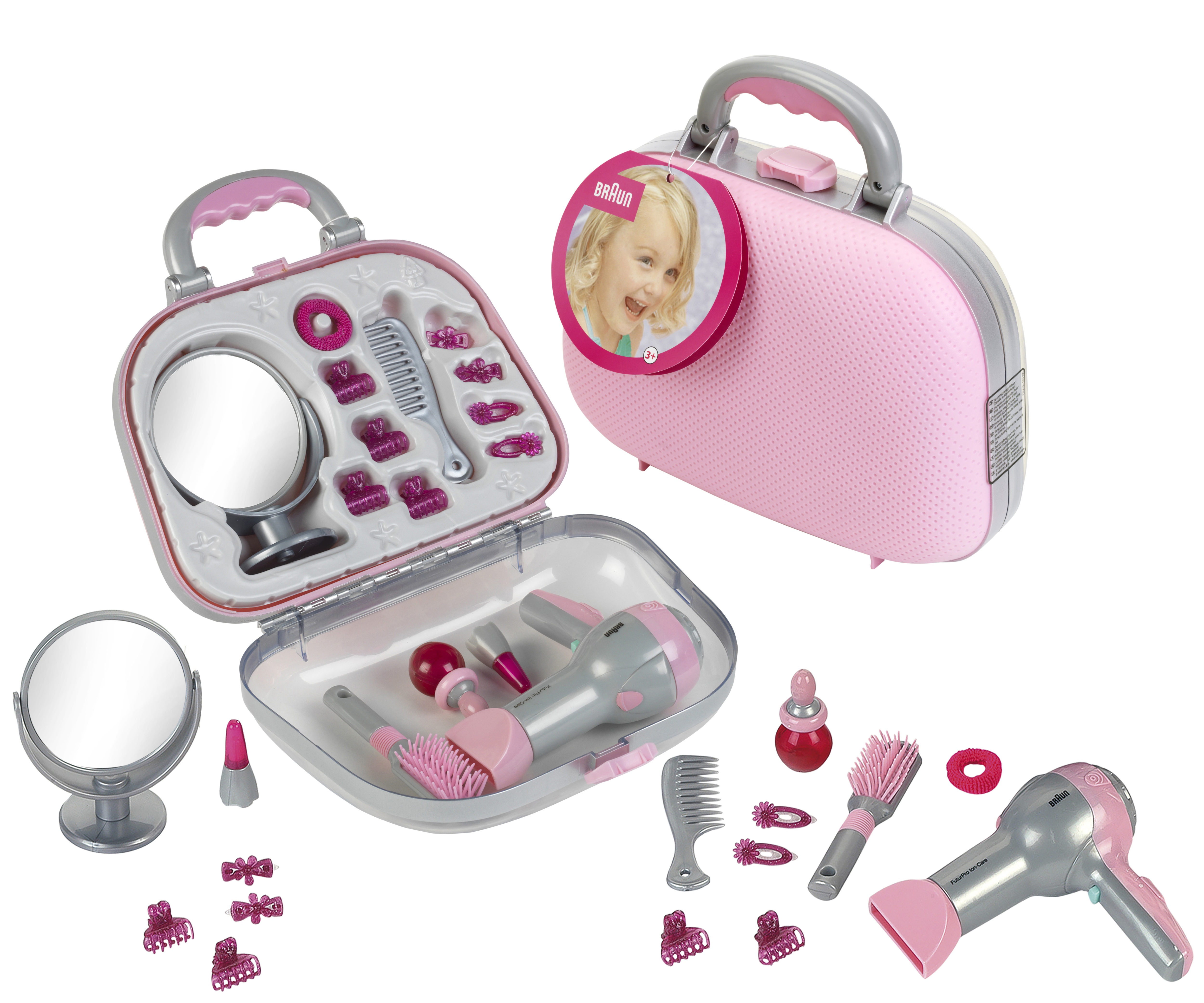 Superbe mallette coiffure transparente BRAUN avec poignée ergonomique pour une prise en main optimale, jolie finition rose piqué au dos. Contient un sèche-cheveux Braun aux fonctions ultra-réalistes : bruitage et léger souffle (sans risque de chauffe). Nombreux autres accessoires : peigne, brosse à cheveux, miroir à pied, produits cosmétiques factices et bijoux de coiffure. De quoi réaliser les plus belles coiffures !