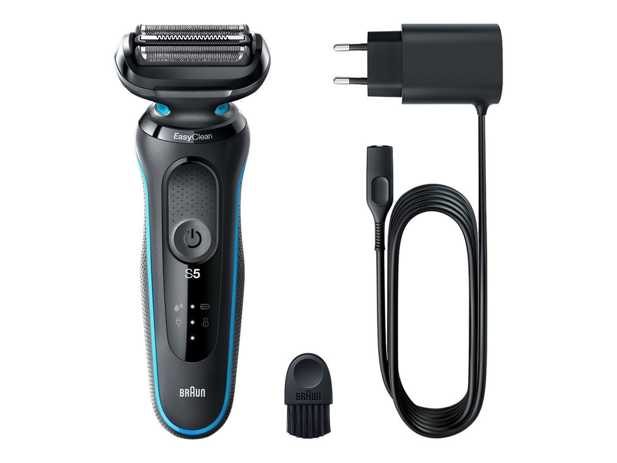 Le rasoir électrique Braun Series 5 pour homme facilite le rasage grâce à 3 lames flexibles qui s’adaptent aux contours de votre visage. Le système EasyClean permet un nettoyage rapide et facile sans retirer la tête de rasage. La batterie Li-Ion offre jusqu’à 3 semaines de rasage et une charge rapide en 5 minutes. Ce rasoir électrique barbe est 100 % étanche, pour une utilisation Wet & Dry. Compatible avec EasyClick pour améliorer votre rasoir. La boîte inclut : 1 rasoir électrique pour homme Series 5 - Menthe 1 capot de protection 1 prise intelligente pour un ajustement automatique aux tensions de 100 à 240 V 1 brosse de nettoyage
