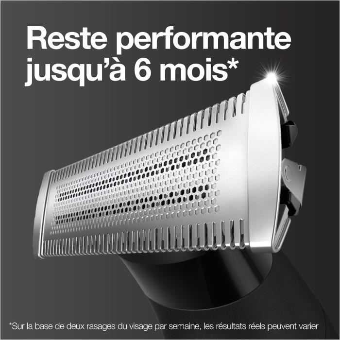 Cette lame et tête de rechange est compatible avec tous les appareils de la gamme Series X de Braun. Elle comporte quatre éléments de coupe, comprenant deux tondeuses latérales et deux zones de rasage centrales. La technologie de lame 4D offre un rasage simple et confortable qui est doux pour la peau. Entièrement étanche et fabriquée à partir d’acier 100 % inoxydable, la lame est conçue pour durer. Elle offre la même performance de coupe jusqu’à 6 mois*. *Sur la base de 2 rasages complets par semaine, les résultats réels peuvent varier