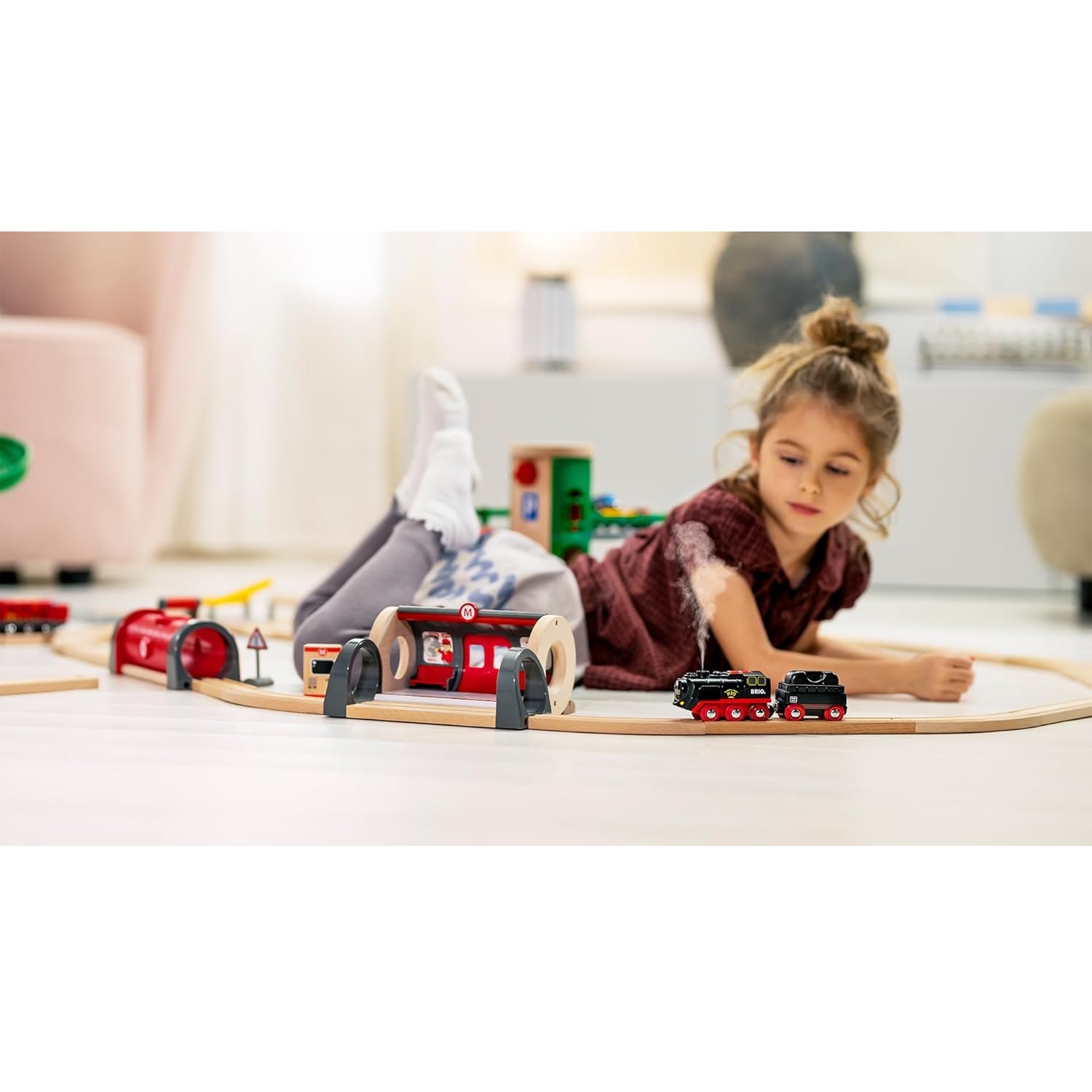 « À toute vapeur ! » Parcourez votre circuit BRIO World à bord de la Locomotive à piles à vapeur 33884 avec ses effets de vapeur réalistes . De la cheminée de cette locomotive à piles sort de la vapeur froide, donc sans risque pour l'enfant, en même temps qu'elle parcourt les rails . Lorsque vous êtes à court d'eau, vous pouvez facilement recharger la locomotive en remplissant la recharge fixée à l'arrière du train. Appuyez sur le bouton rouge de marche situé sur le dessus de la locomotive : la lumière avant s'allume, la vapeur commence à monter, et vous voilà partis pour de nouvelles aventures ferroviaires inoubliables.