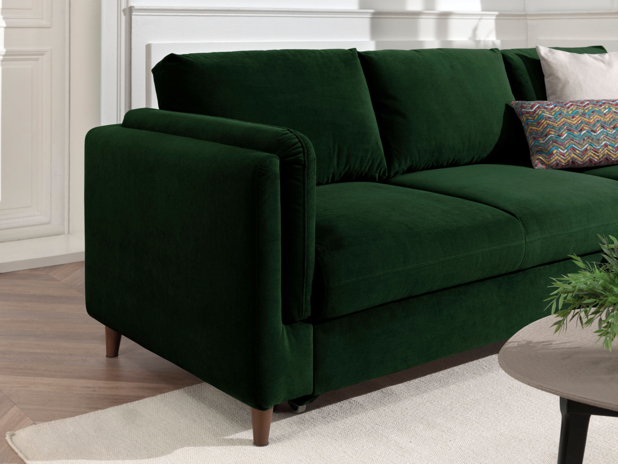 Le canapé d’angle convertible Brooke sera votre allié confort et détente pour votre salon. Décliné en un large choix de couleurs, vous pourrez associer votre décoration d’intérieur et votre canapé Brooke facilement. Son style travaillé et ses accoudoirs uniques rendent votre canapé élégant et enveloppant. Son revêtement en velours est agréable au toucher et confortable à l’assise. Ses pieds en bois wengé apportent de la finition au canapé Brooke. Les coussins de dossiers sont travaillés afin qu'ils gardent leur souplesse ainsi que leur forme.