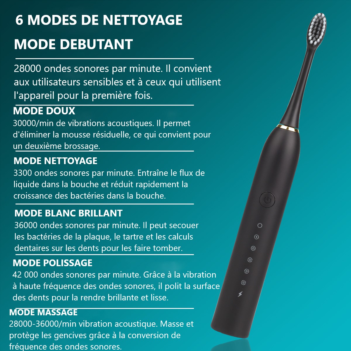 • La brosse à dents électrique est un outil innovant pour une hygiène bucco-dentaire optimale. • Avec son niveau d'étanchéité IPX7, vous pouvez en toute sécurité. • Les 6 modes de nettoyage offrent une variété de choix pour un nettoyage personnalisé en fonction de vos besoins. • Les poils de qualité assurent une utilisation sûre pour votre bouche. • La puissance de 1,5W et la tension nominale de DC 5V garantissent une performance optimale. • La fréquence de vibration allant de 32000 à 42000 fois par minute offre un nettoyage efficace et en profondeur. • Avec cet outil, vous pouvez obtenir des dents plus blanches et plus saines en un rien de temps. • Choisissez la brosse à dents électrique pour une routine d'hygiène bucco-dentaire plus efficace et plus agréable.