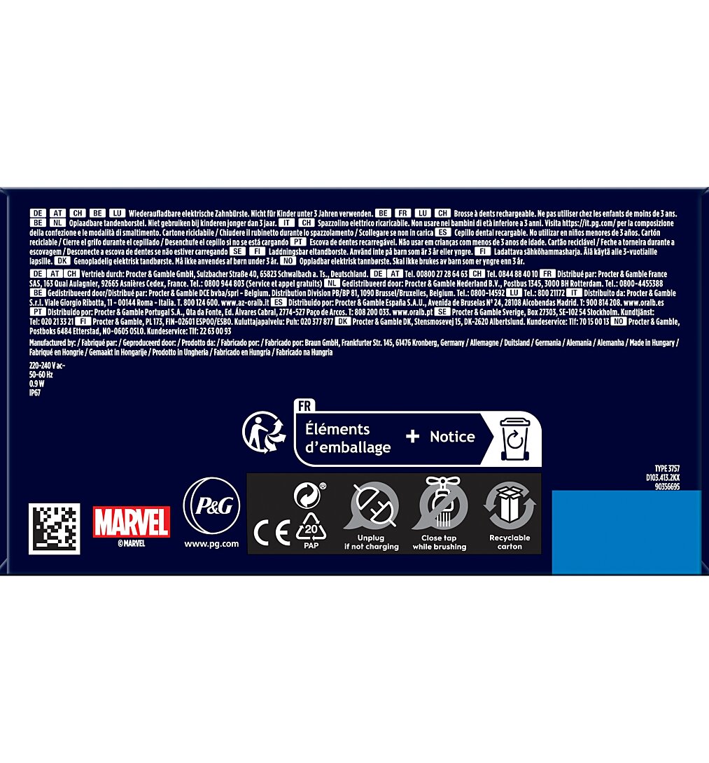 2 vitesses de rotation. Une boîte de transport pour l'hygiène. Et des stickers pour personnaliser. Et surtout : SPIDERMAN !!
