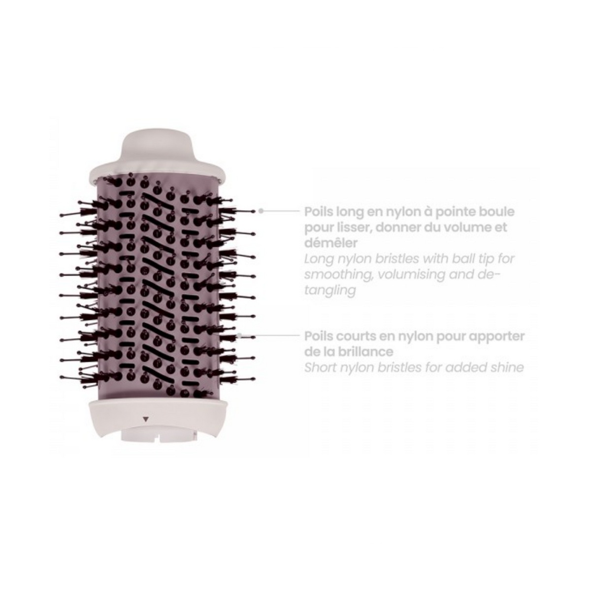 Poils long en nylon à pointe boule pour lisser, donner du volume et démêler et poils courts en nylon pour apporter de la brillance.