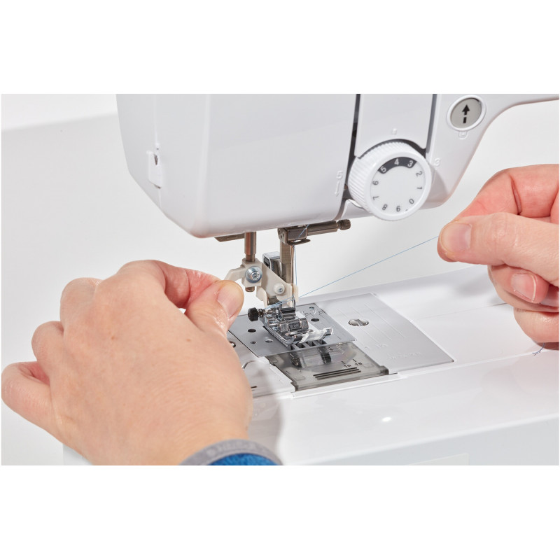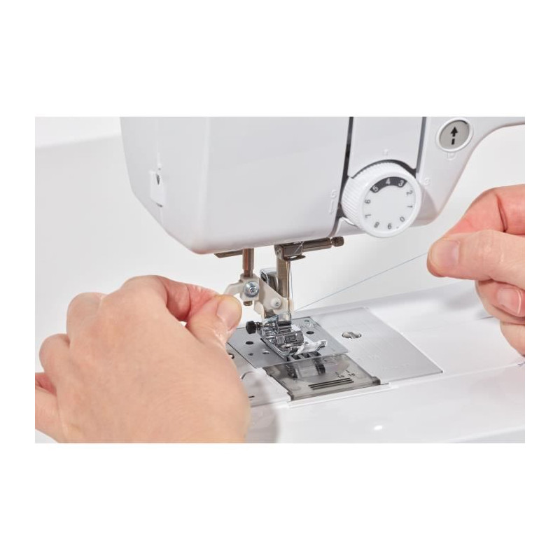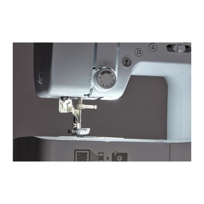 D'une technologie électronique, facile et conviviale d'utilisation avec son grand espace de travail. Tres simple d'utilisation ! Ecran LCD, touches de sélection, éclairage puissant et apaisant par diode LED, systeme d'enfile-aiguille, remplissage et mise en place rapides de la canette horizontale, fonction couture arriere