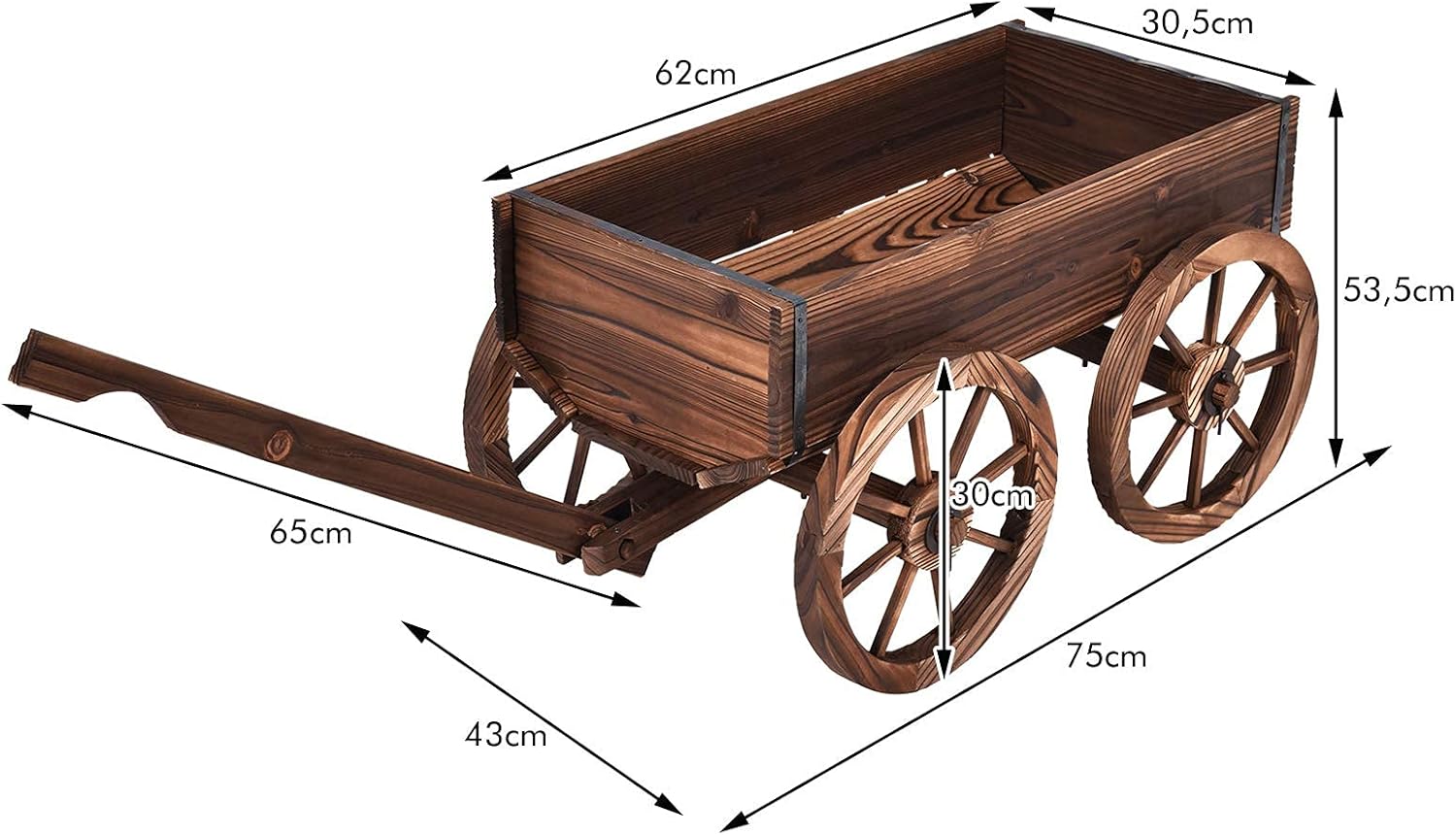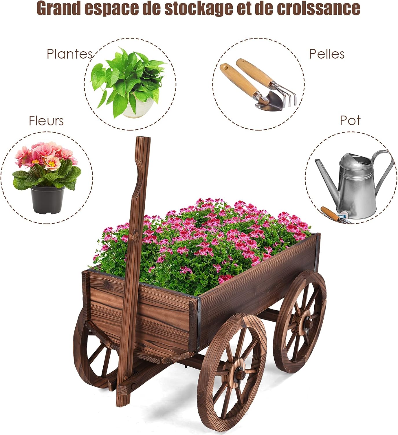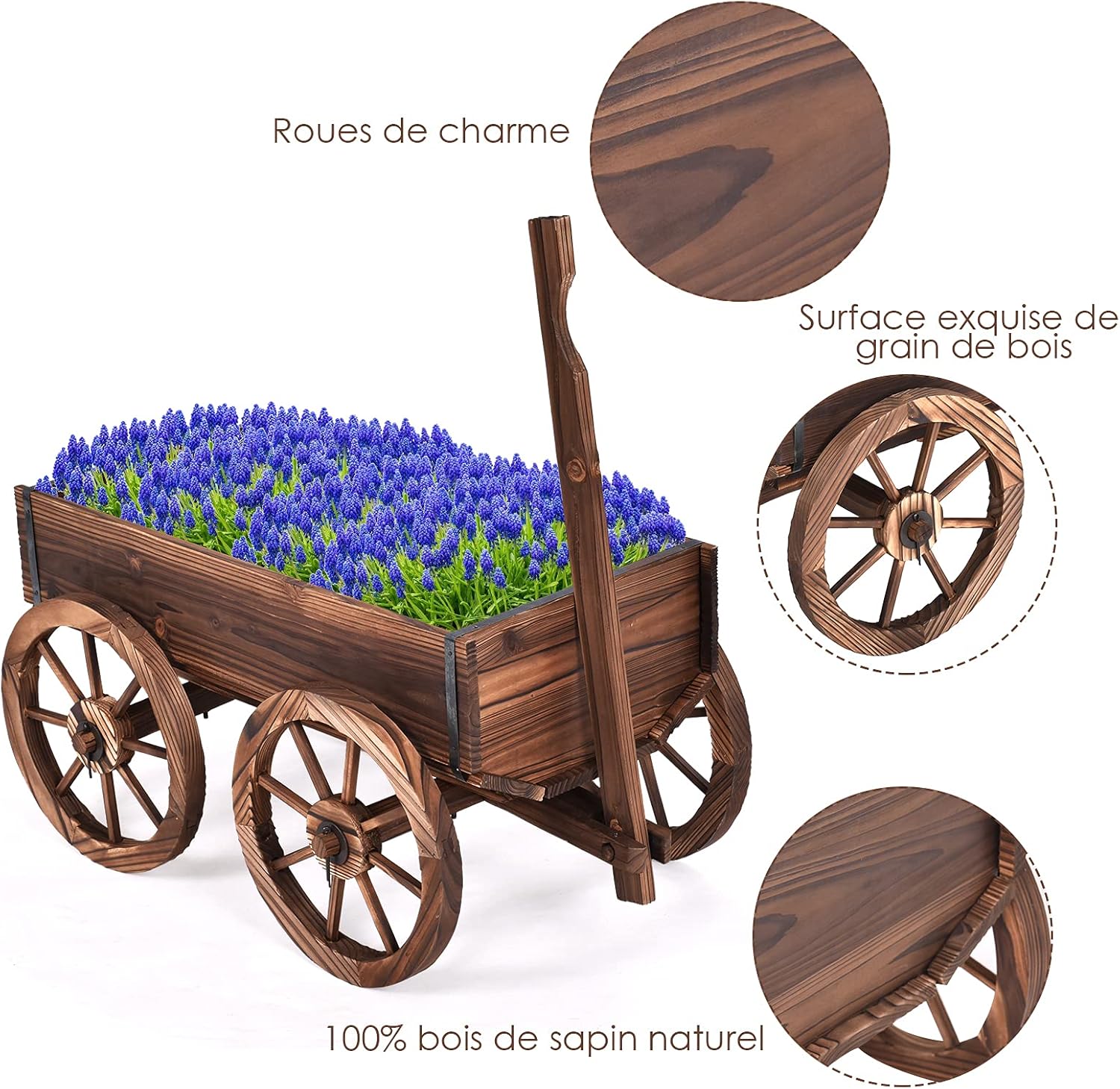 | Libellé | Brouette à fleurs en sapin carbonisé avec poignée réglable et 4 roues,chariot à fleurs avec trou marron |