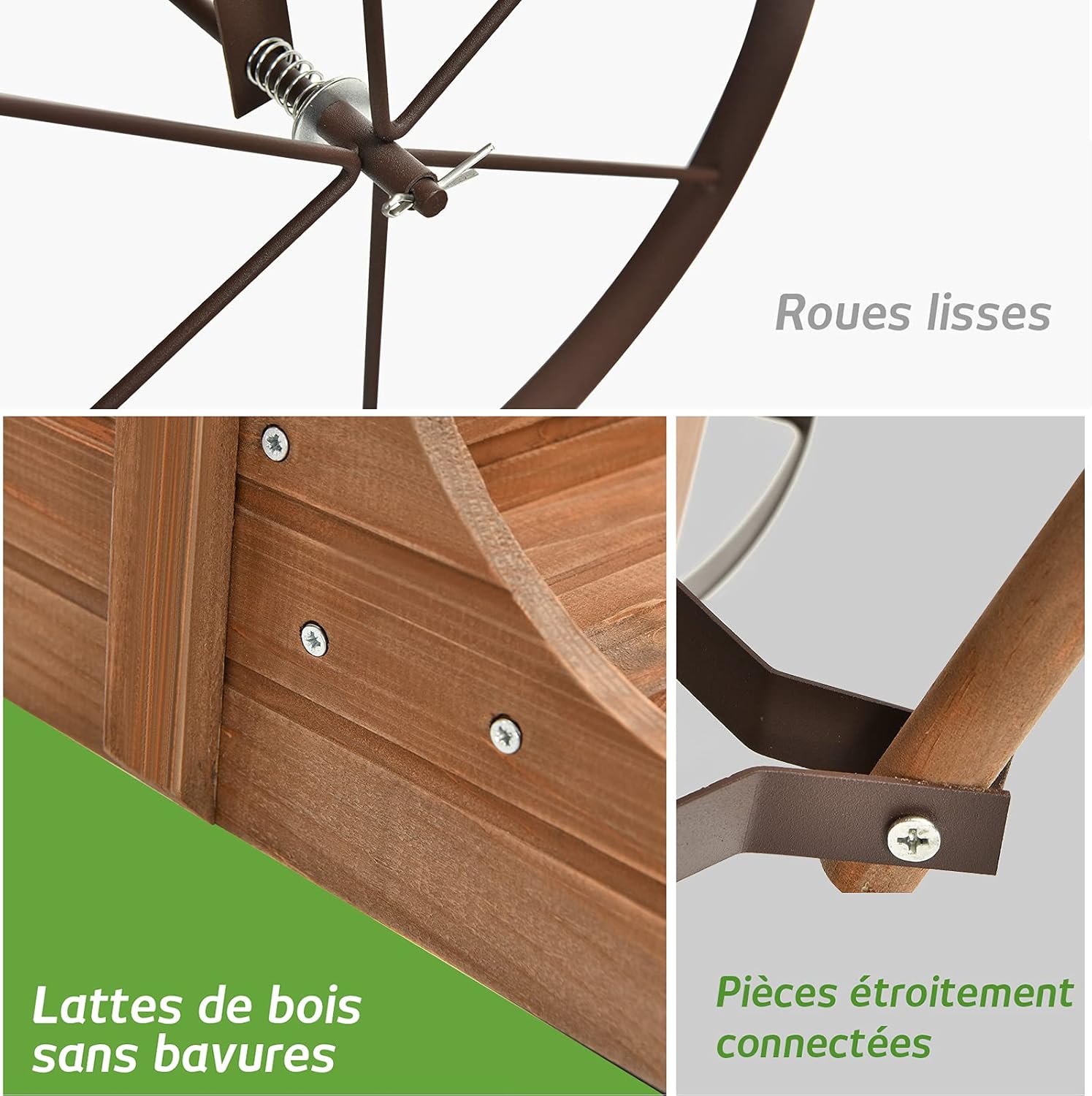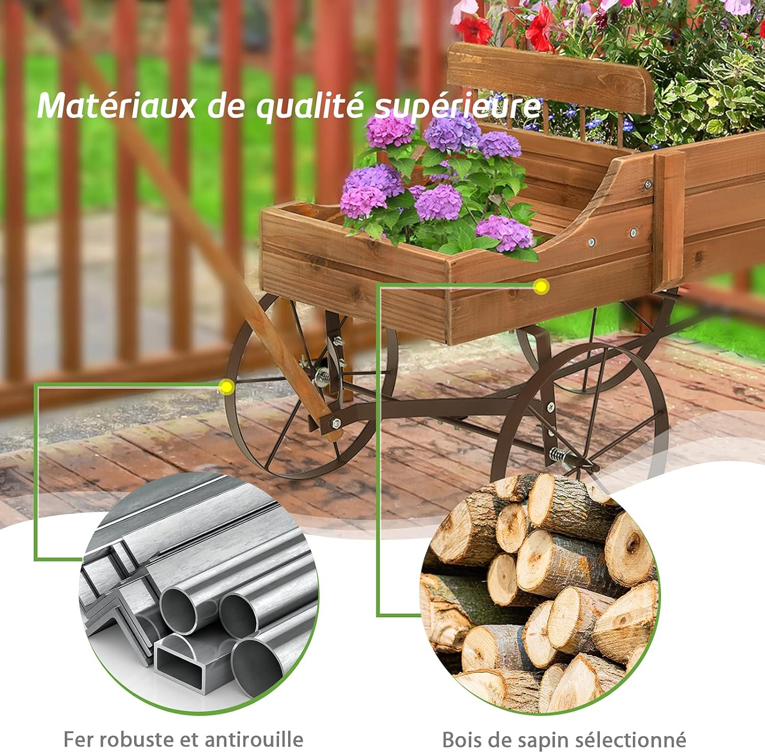 | Libellé | Brouette à jardin en bois avec 2 compartiments à planter, roues métalliques, poignée à l'avant (Marron) |