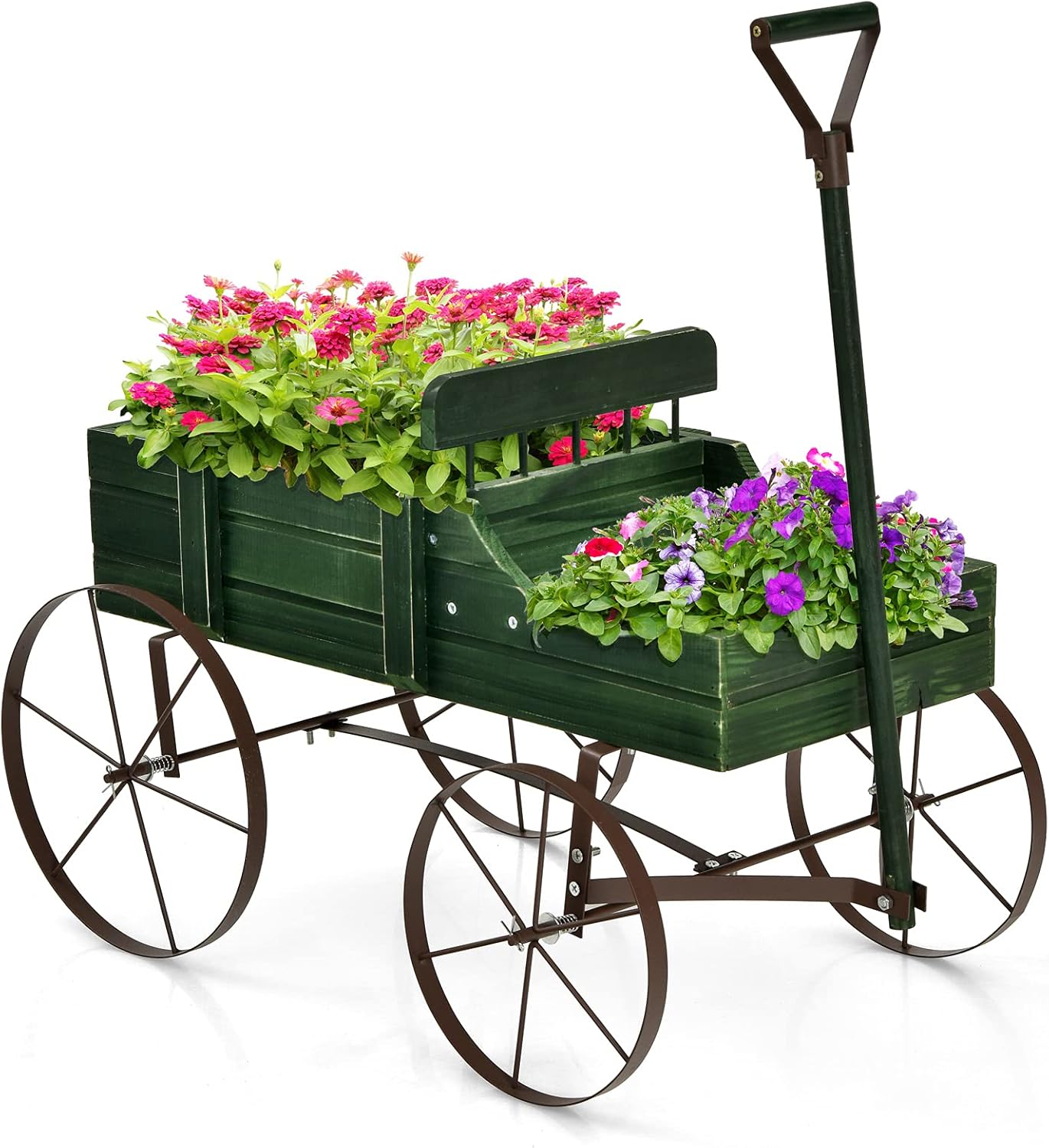 Brouette à jardin en bois avec 2 compartiments à planter, roues métalliques, poignée à l'avant (Vert)