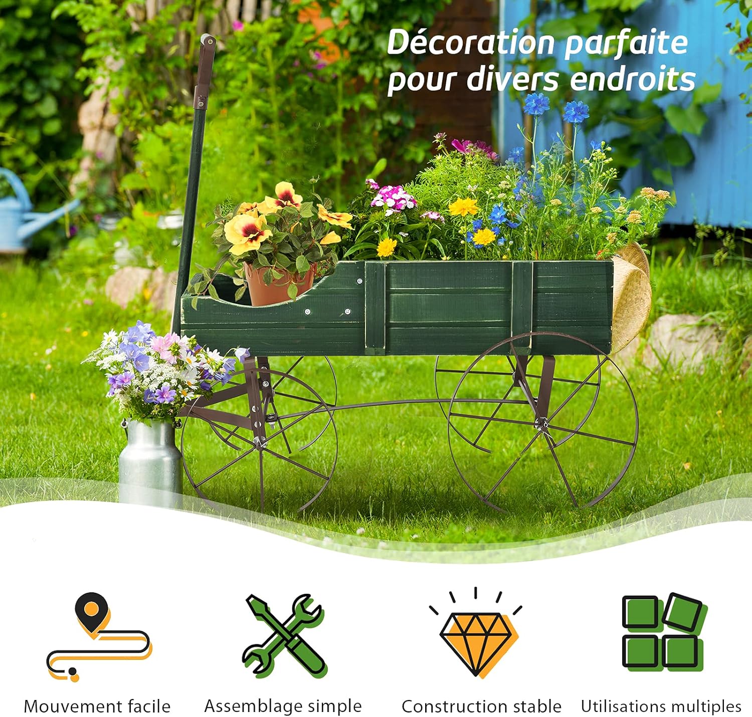 | Libellé | Brouette à jardin en bois avec 2 compartiments à planter, roues métalliques, poignée à l'avant (Vert) |