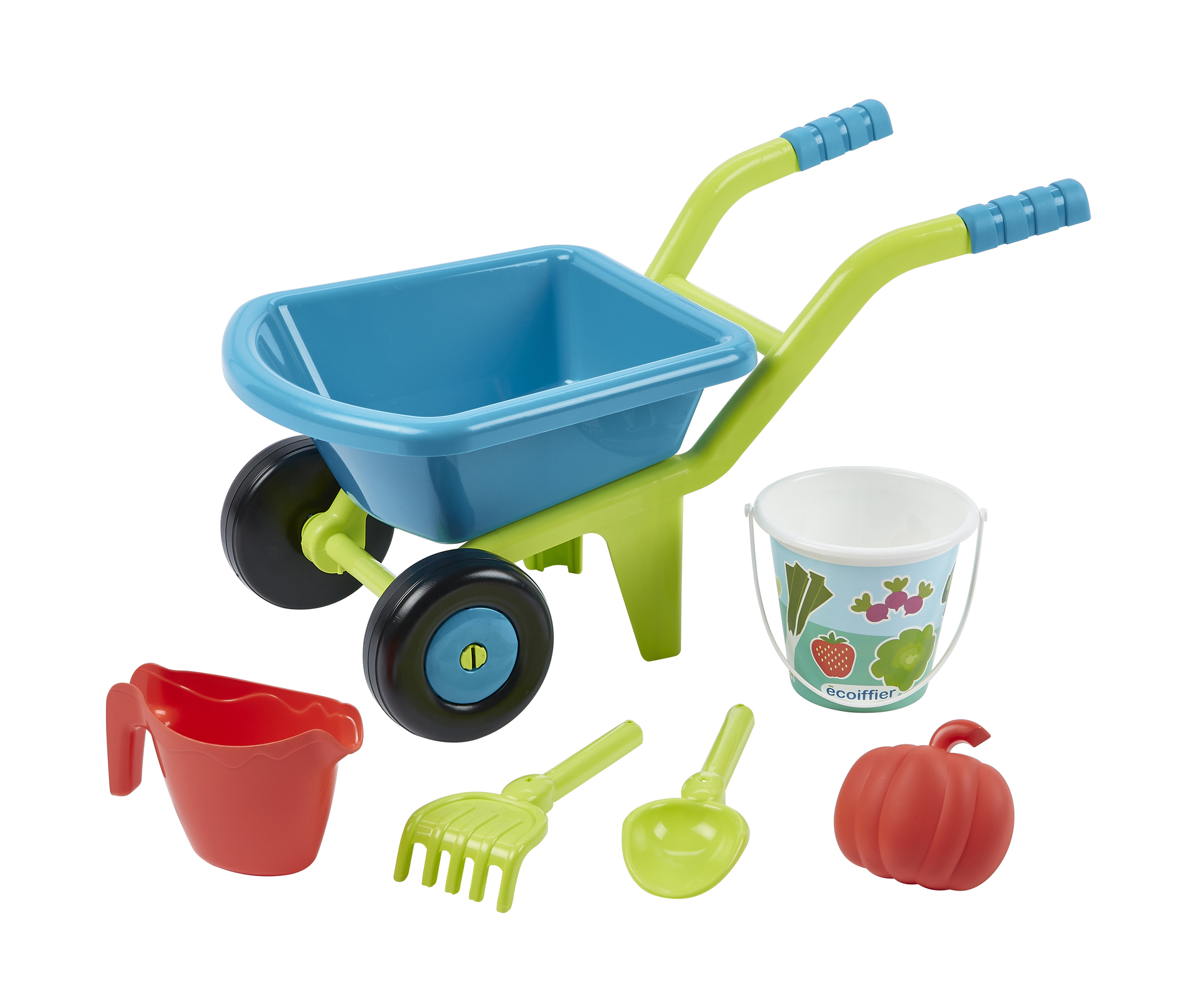 Une brouette à 2 roues pour une stabilité maximale avec deux poignées rapportées pour une prise en main confortable. Garnie d'un seau 15 cm décoré sur le thème des fruits et légumes ainsi qu'un arrosoir, une doublette et un moule à sable en forme de légume. Fabrication Française.