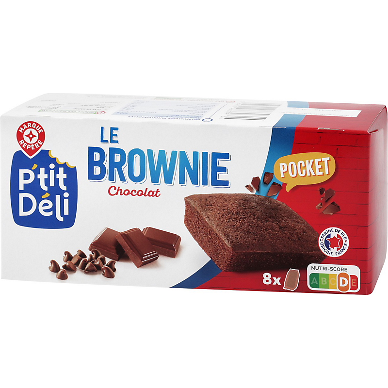 INGREDIENTS : Sucre ; huile de colza ; oeufs 16 % ; farine de blé 15 % ; stabilisant: glycérol ; pépite de chocolat 5,9% (sucre, pâte de cacao, beurre de cacao, émulsifiant : lécithines (soja)) ; cacao en poudre 4,7% ; sirop de sucre inverti ; fécule de manioc ; sel ; poudres à lever : E500, E331 (dont blé) ; arôme.